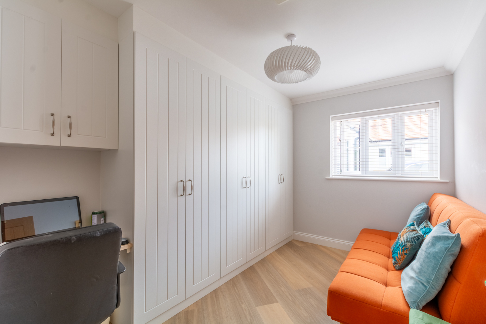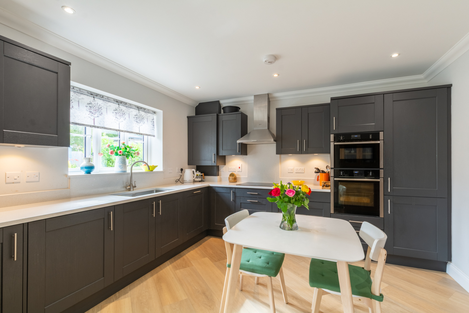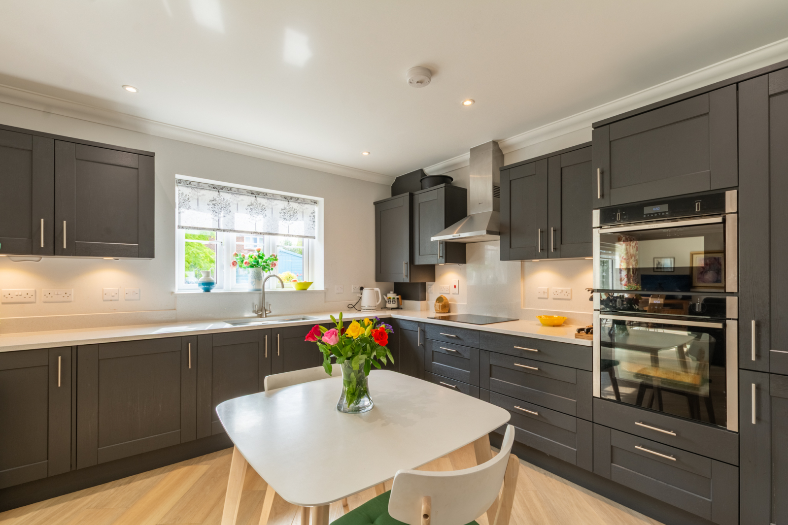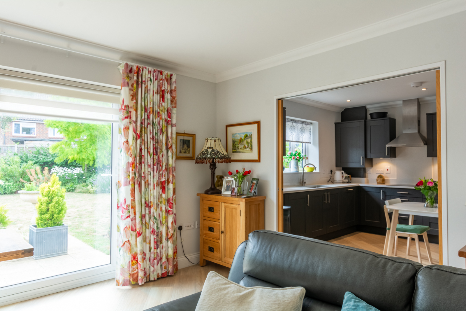 A bright entrance hall leads to all three bedrooms and flows seamlessly into the main living space, where Karndean flooring enhances the sense of light and space. The generous open-plan living/dining area features bi-fold doors opening onto a westerly facing garden with a patio, ideal for entertaining. Adjacent to the living area, the kitchen is cleverly accessed via twin pocket doors that slide discreetly into the wall, creating a flexible, open-plan feel. Finished with sleek units, quartz work surfaces and excellent storage, it also provides space for a breakfast table.