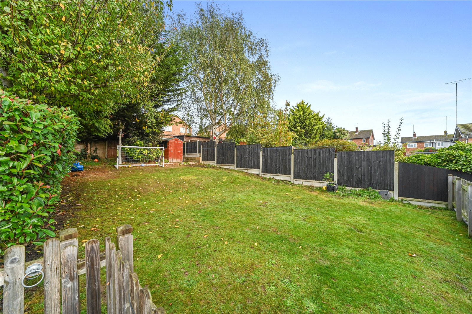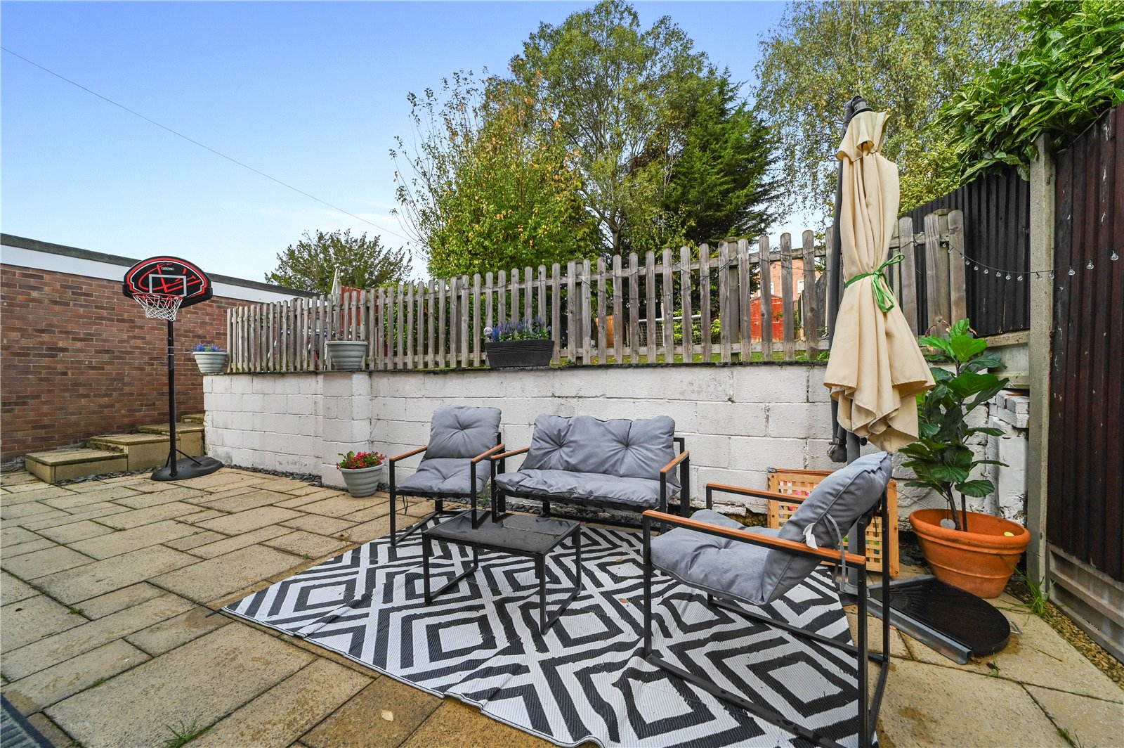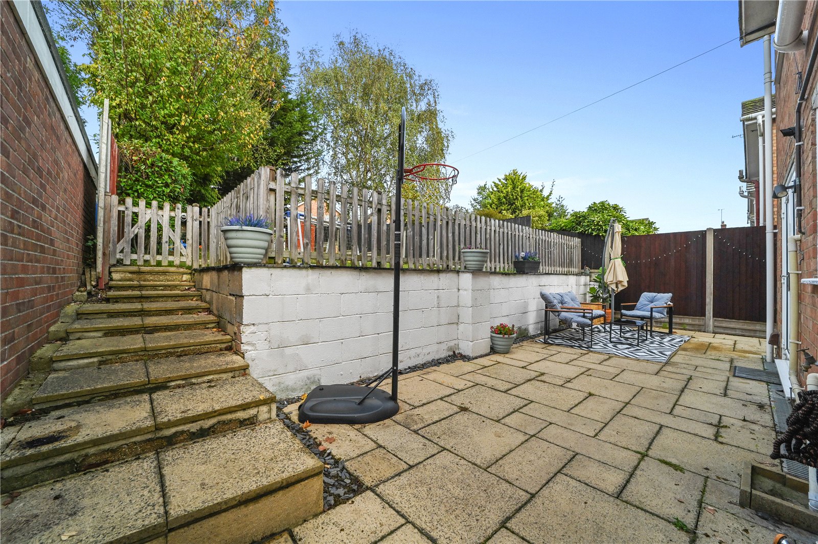 Outside, the rear garden is enclosed and neatly tiered, with a paved seating area directly outside the dining room, and steps leading up to a lawned area and storage shed. The layout makes great use of the available space, with scope for landscaping or planting. To the front, a private driveway provides off-road parking.