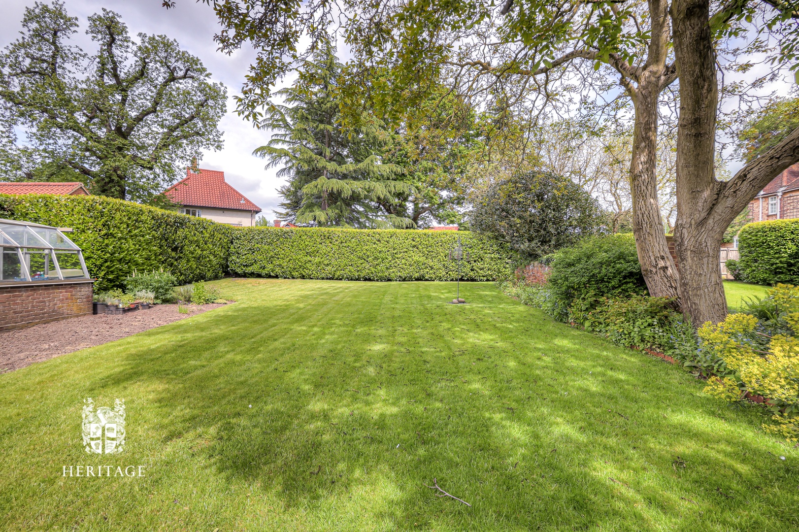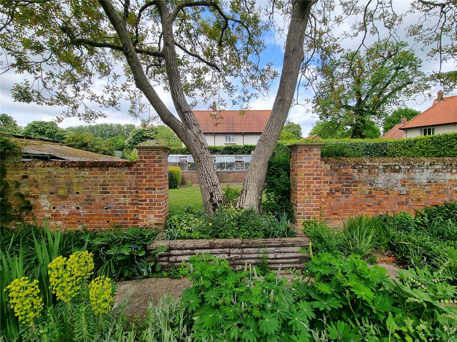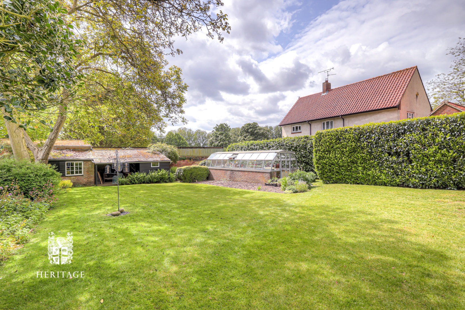 The gardens are beautifully landscaped and arranged into distinct areas. The walled front garden includes ample parking, a garage, lawn and established shrubs and trees. Behind a beech hedge is a second formal garden — private, peaceful and picturesque. Beyond, separated by a brick wall, lies a further garden area with a large heated greenhouse on a brick base and useful outbuildings, ideal for keen gardeners.