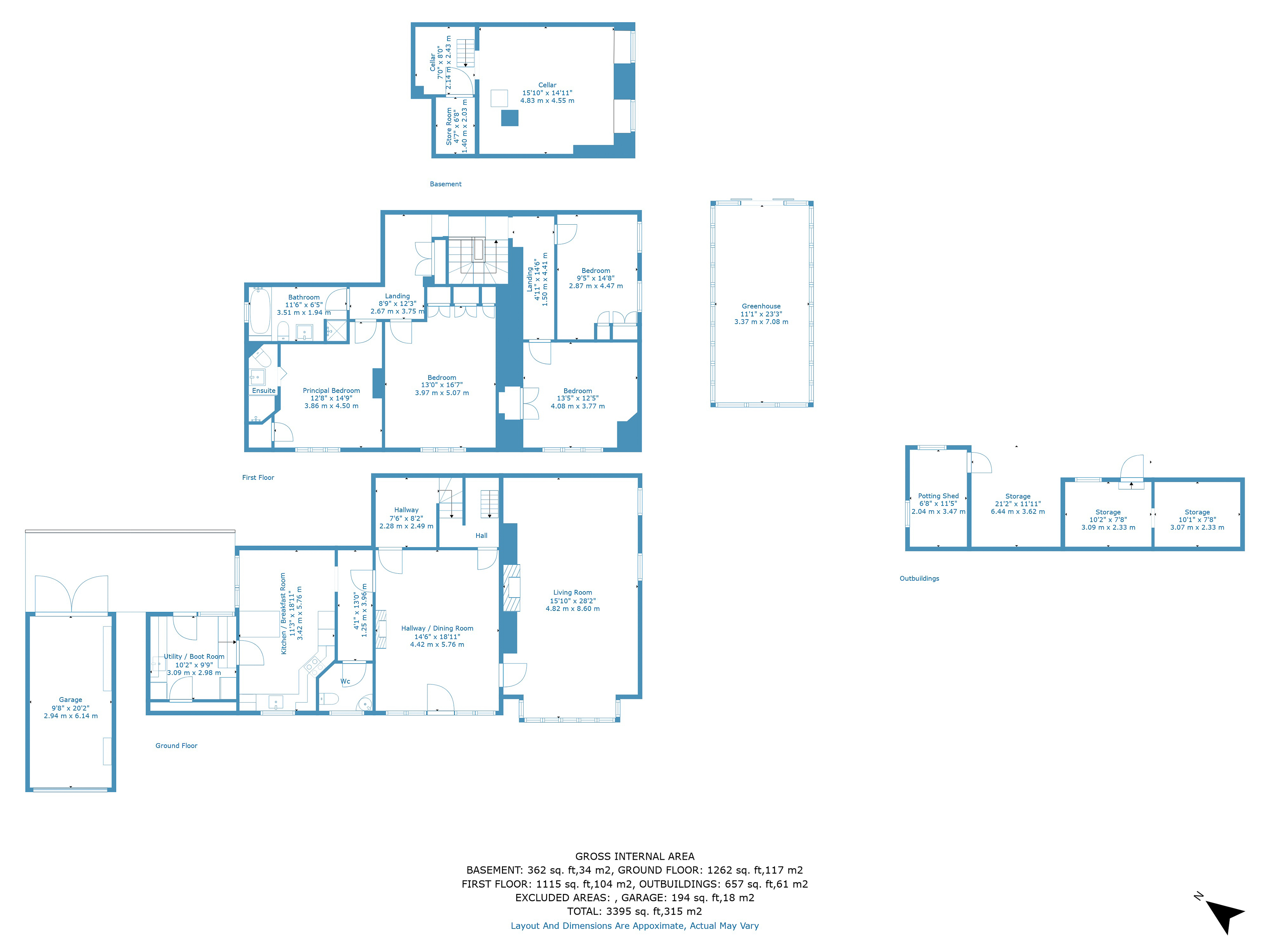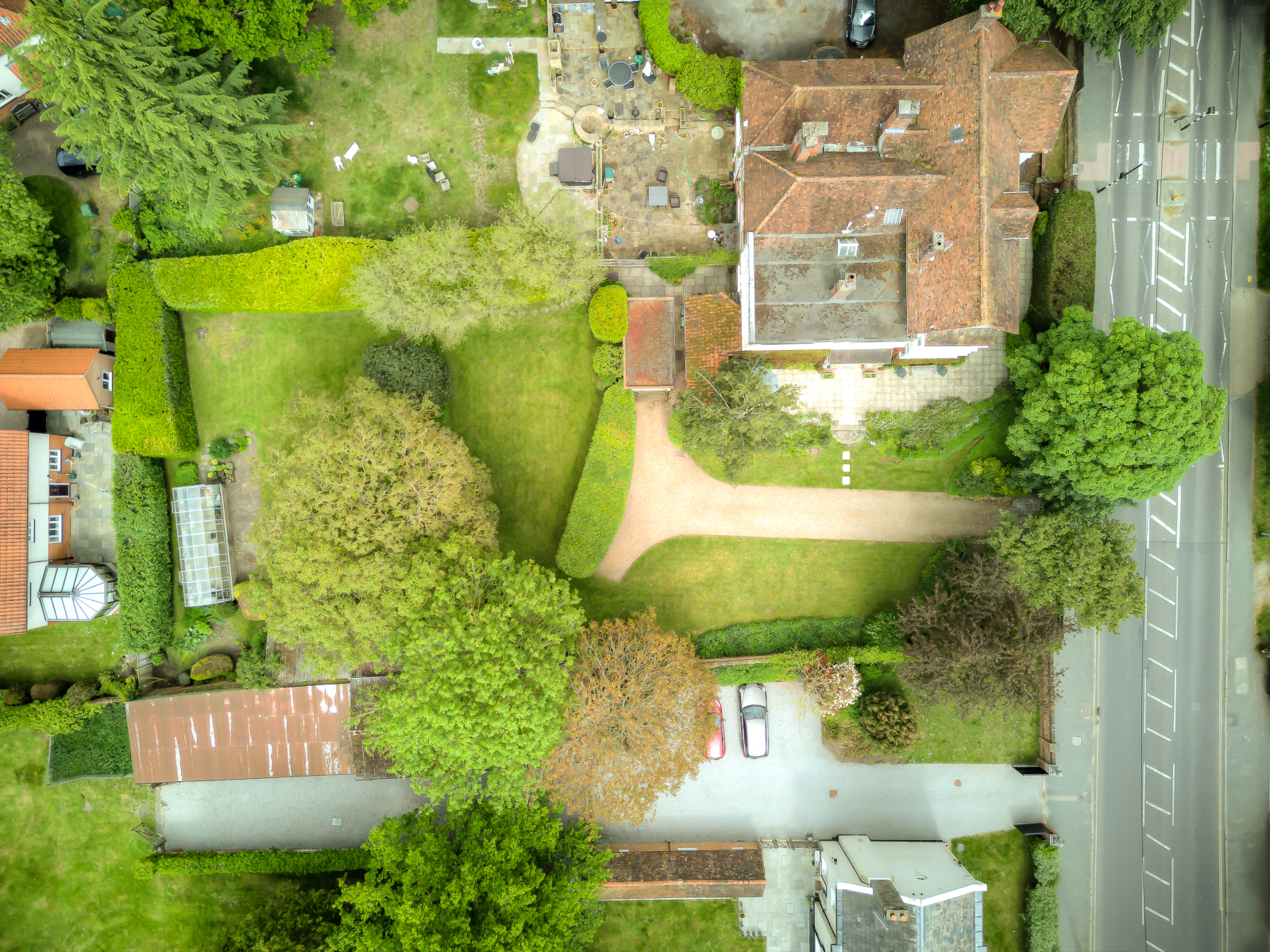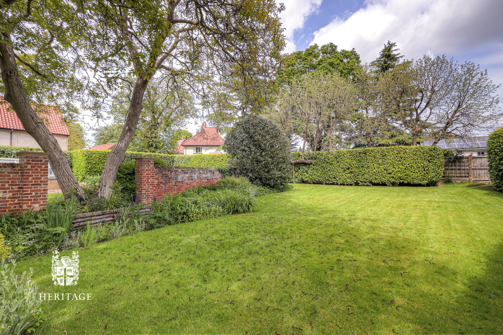 The gardens are beautifully landscaped and arranged into distinct areas. The walled front garden includes ample parking, a garage, lawn and established shrubs and trees. Behind a beech hedge is a second formal garden — private, peaceful and picturesque. Beyond, separated by a brick wall, lies a further garden area with a large heated greenhouse on a brick base and useful outbuildings, ideal for keen gardeners.