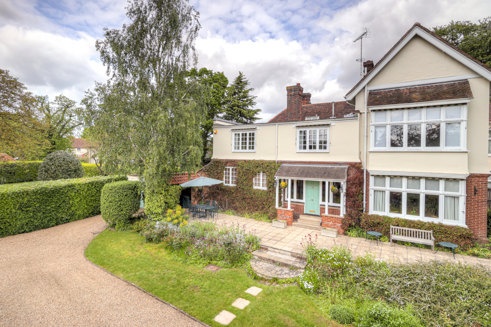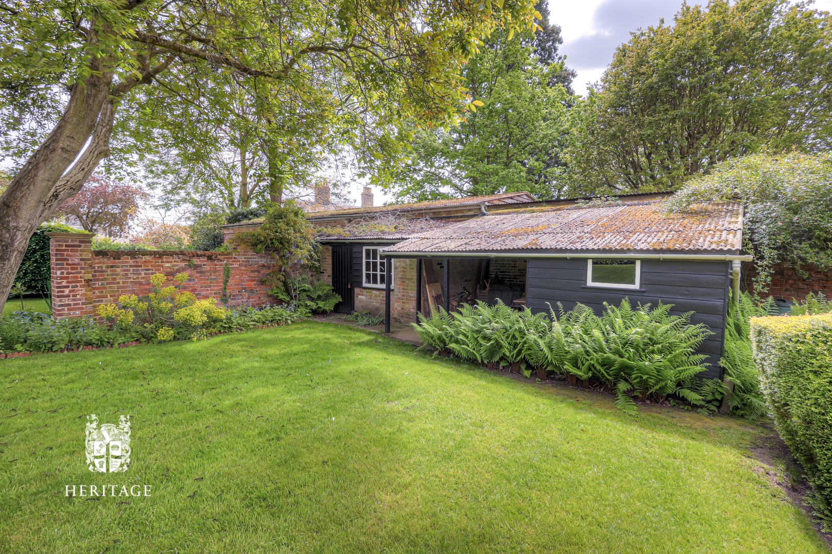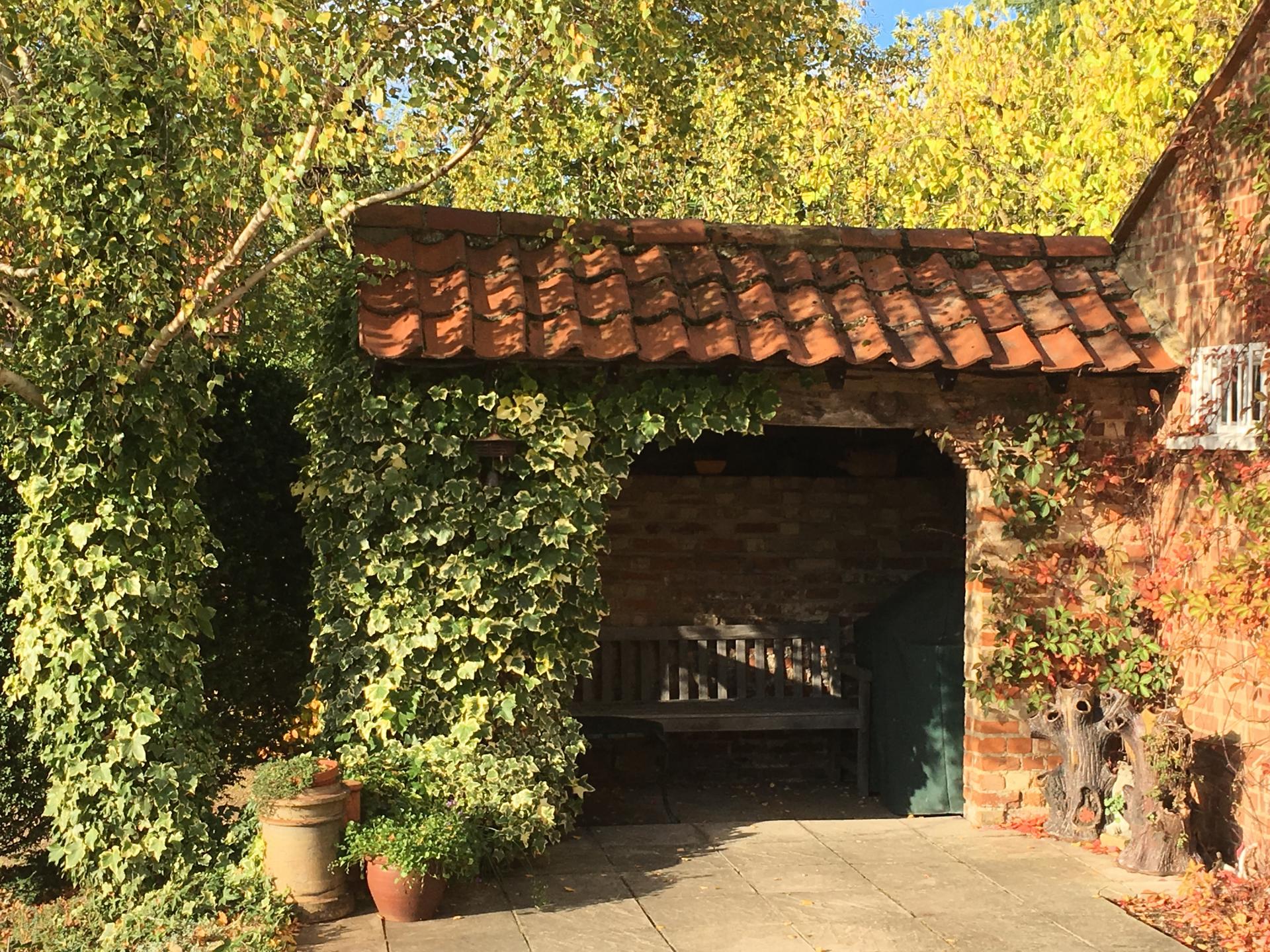 Approached from the parking area, a series of steps lead up to a west-facing terrace where an original brick and pantile summerhouse sets the tone, offering a charming and welcoming introduction.