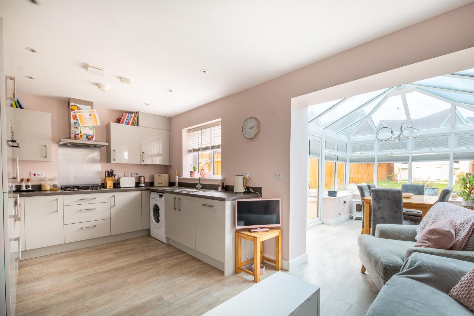 At the rear, the current owners have enhanced the living space by creating an open-plan kitchen and family room with the addition of a conservatory. The kitchen is fitted with a wide range of high-gloss units and ample worktop space. Integrated appliances include a 1½ oven, gas hob, and fridge freezer. The kitchen also features a seating area, making it both a functional and sociable space. The adjoining dining area is a great size and enjoys a pleasant view over the rear garden.