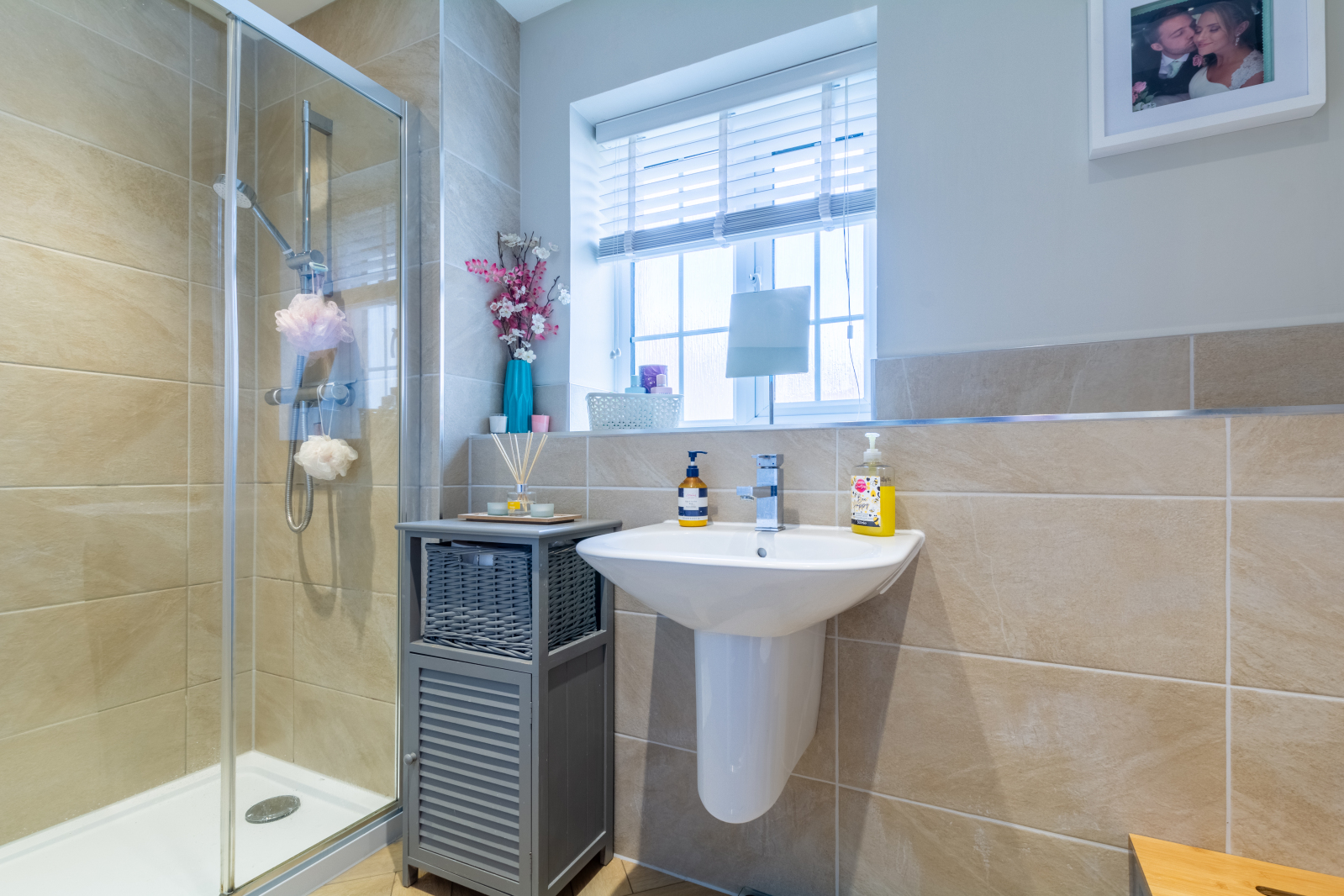 Upstairs, a spacious landing connects to all four bedrooms. The principal bedroom is a large double with a fitted wardrobe and access to a stylish en-suite shower room. Two further double bedrooms offer plenty of space for free-standing furniture, while the fourth bedroom is also generously sized and currently used as a home office but easily accommodates a double bed. The family bathroom includes a modern suite with attractive tiling and a shower attachment.