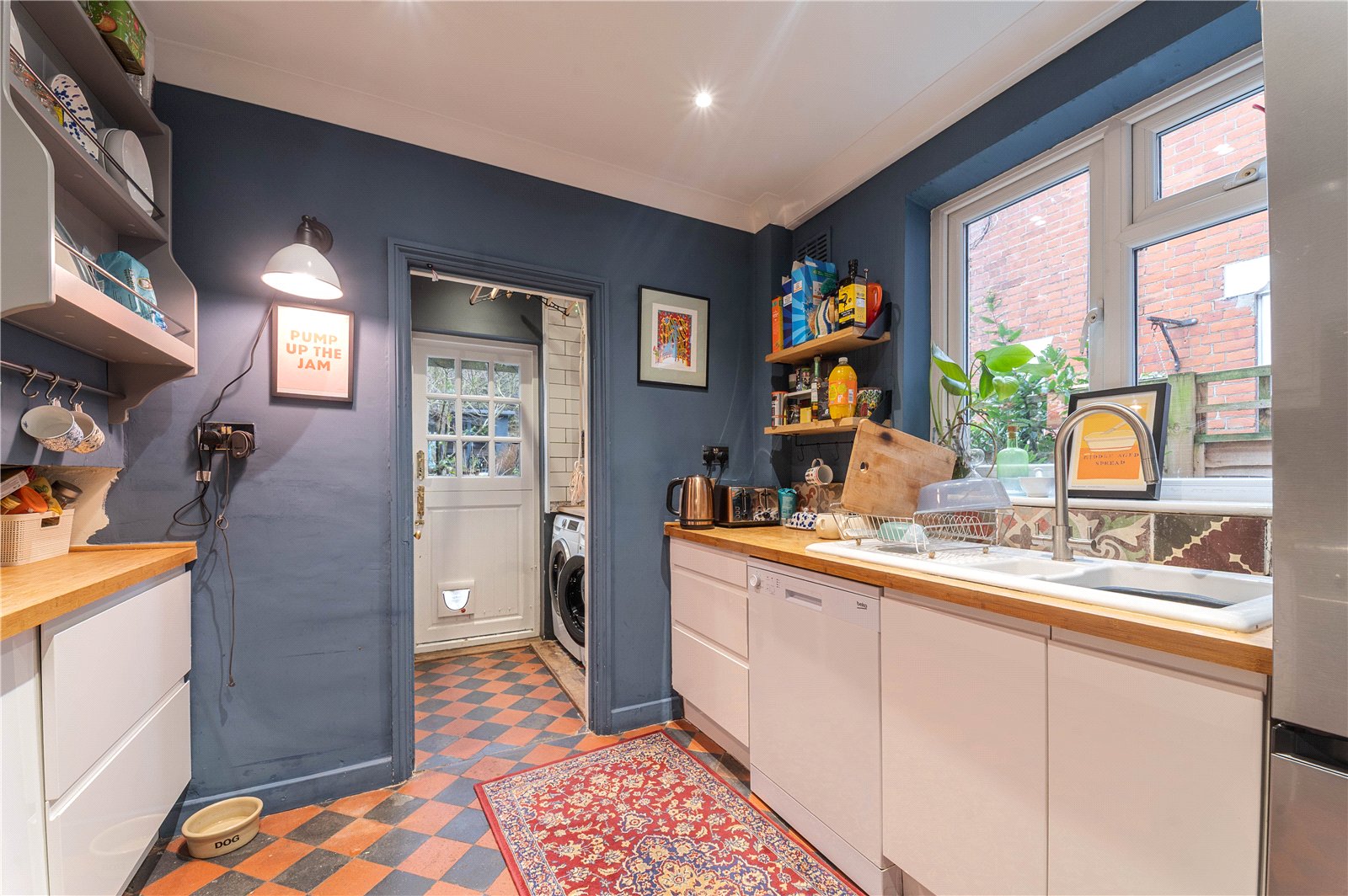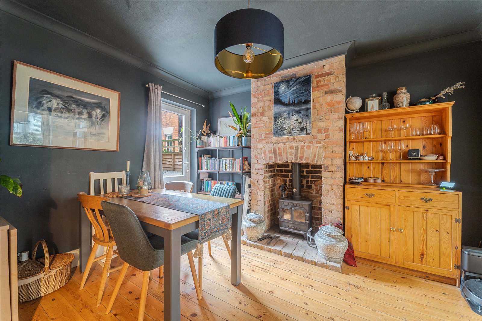 The ground floor is arranged to offer both comfort and practicality, with a welcoming living room to the front featuring period proportions and a bay window that draws in natural light. Beyond, the dining room provides an excellent everyday and entertaining space, centred around a charming, exposed brick fireplace that adds warmth and character.
