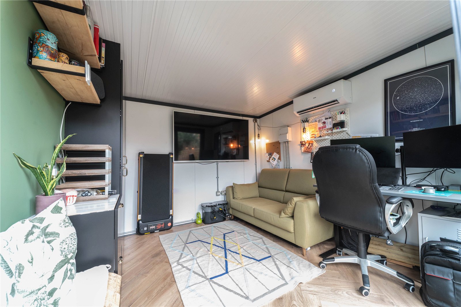 To the rear, the property enjoys a south-west facing garden which provides a private and sunny outdoor space throughout much of the day. The garden is mainly laid to lawn with established planting and a winding pathway leading to the rear. Positioned within the garden is a detached outside office, offering a valuable and versatile space ideal for home working, creative use or hobbies, while still allowing the garden itself to be fully enjoyed.
