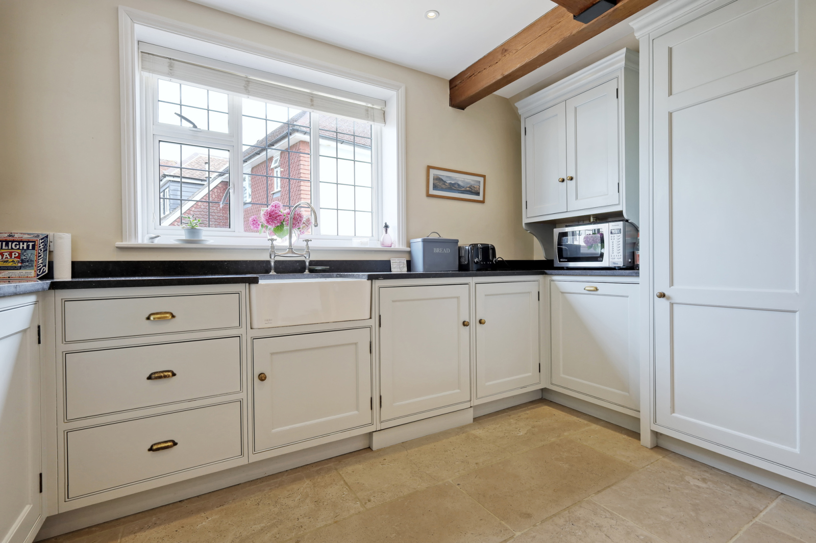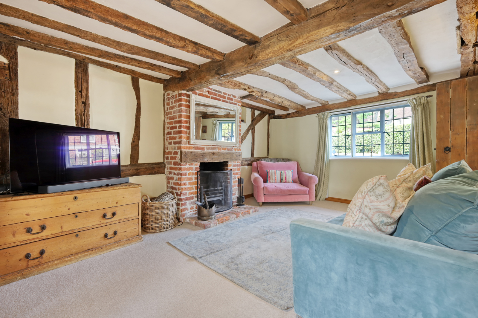 The ground floor offers a wonderful sense of warmth and history. The cosy living room features exposed beams, characterful brickwork and a working open fireplace—an inviting space for relaxed evenings. A second reception room sits opposite, currently used as a playroom but ideal as a formal dining room or snug, giving great versatility to the layout. The stylish kitchen/diner is a real highlight, fitted with bespoke Shaker-style cabinetry by renowned local makers Humphrey Munson, complete with an electric Aga and underfloor heating. Beyond this, the striking double height sunroom fills the rear of the home with natural light, creating the perfect spot for morning coffee. A useful study sits just off the kitchen, offering an excellent work or study space.