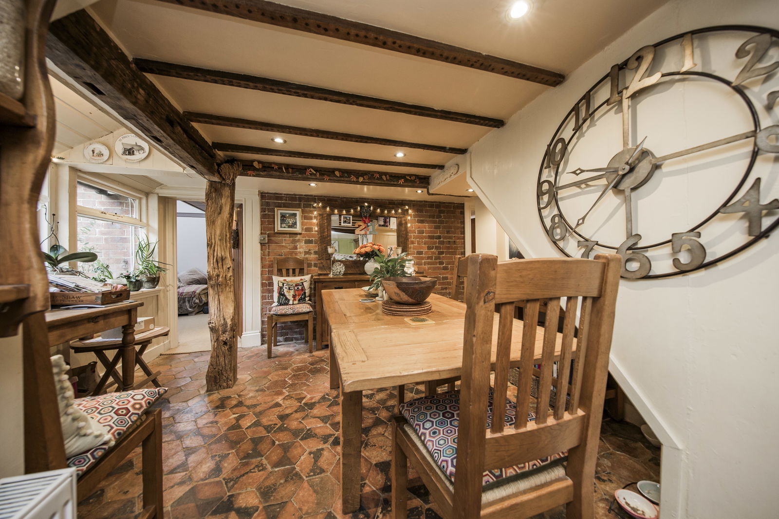 Dining area: Window overlooking the rear garden. Beamed ceiling and feature exposed brick wall. Inset spotlights. Tiled floor. Radiator.