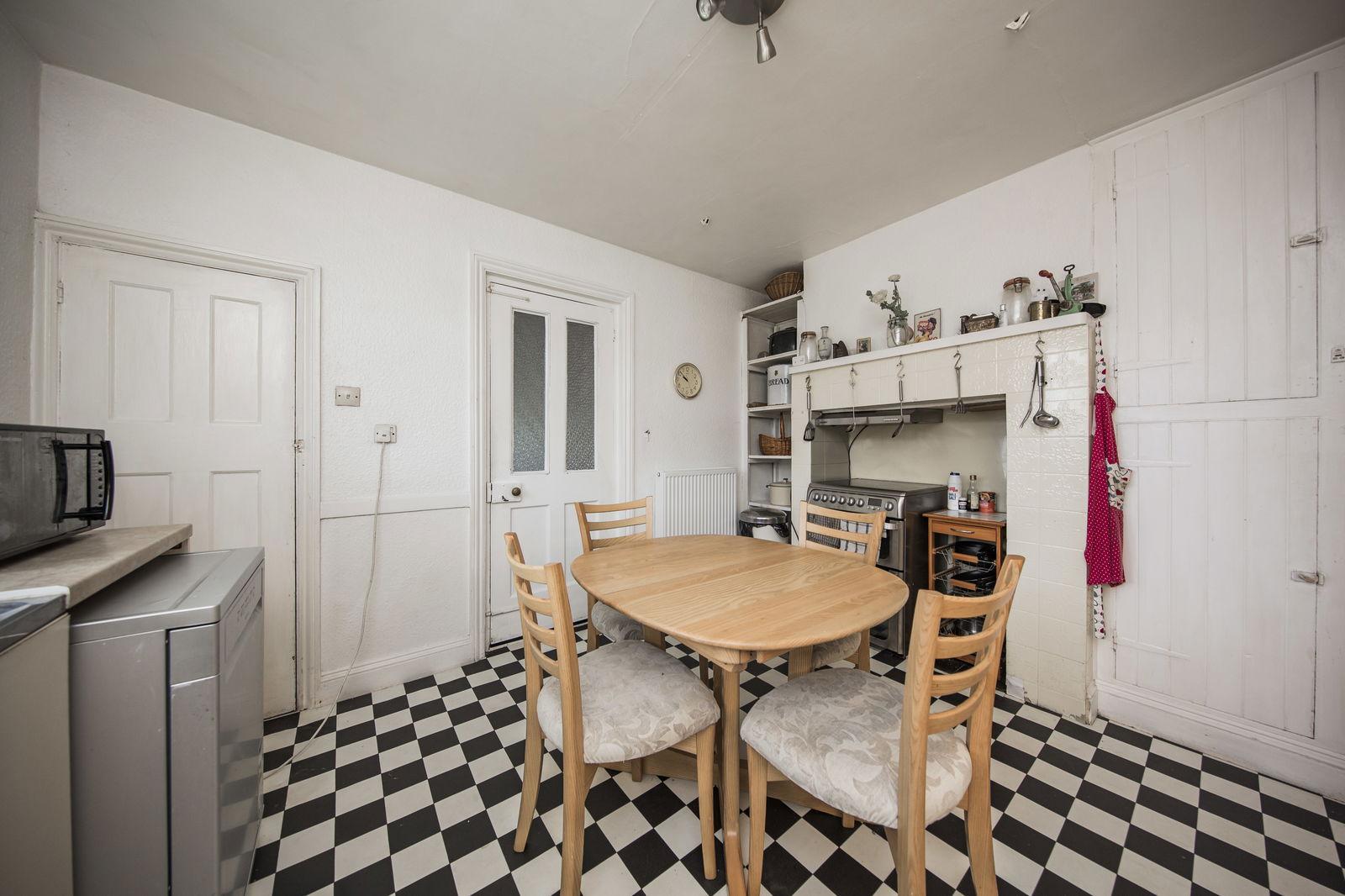 KITCHEN/BREAKFAST ROOM: uPVC double glazed window to front. Sink and drainer. Matching worktops with cupboards and drawer units below. Localised tiling. Tiled recess space for cooker with shelving aside and further useful storage. Door to deep larder cupboard with quarry tiled flooring and window to front. Wall-mounted electric heater. Radiator. Further door to: