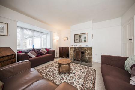 SITTING ROOM: A dual aspect room with uPVC double glazed French doors and bay window to side. Natural stone built fireplace with paved hearth. Picture rail. Wall light points.