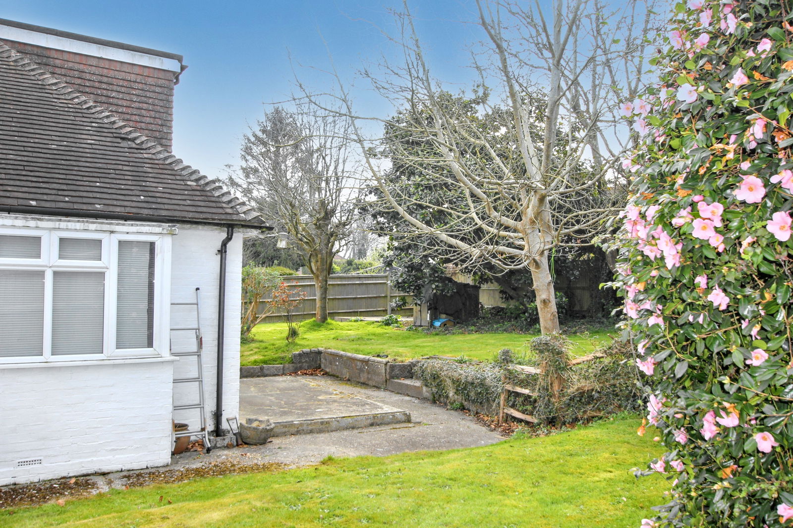 OUTSIDE: To the front of the property is a gated DRIVEWAY providing off-road parking and access to areas of lawn. The REAR GARDEN is fence and hedge enclosed with various flagstone paved areas offering privacy and seclusion amid areas of lawn