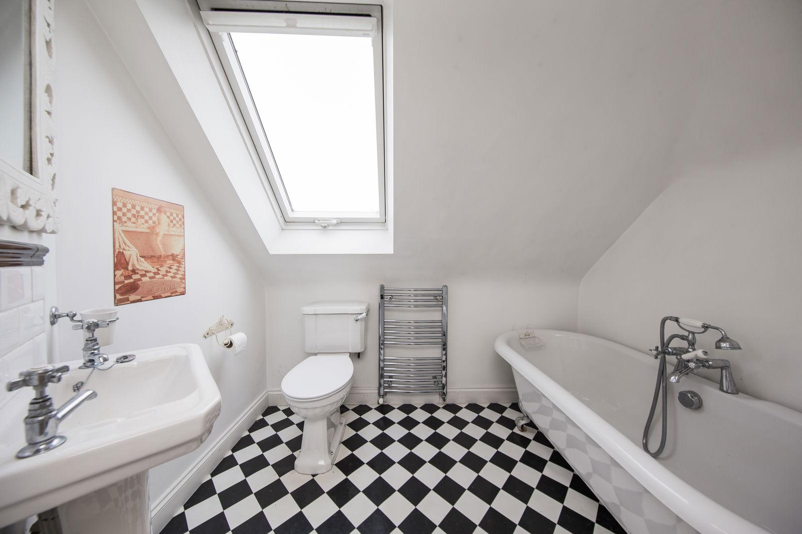 ENSUITE BATHROOM: Double glazed Velux window, White suite with chrome effect fitments comprising low-level WC, pedestal wash basin and roll top claw foot bath with mixer tap/shower attachment over. Chrome effect ladder style towel rail.