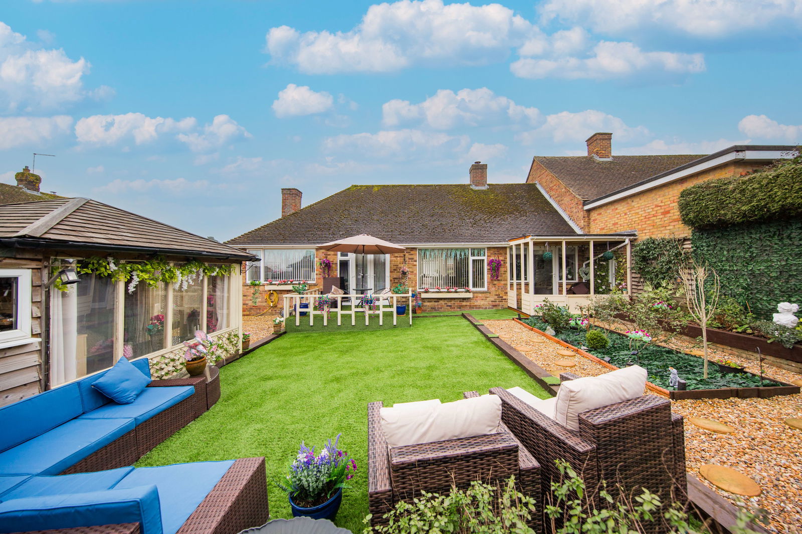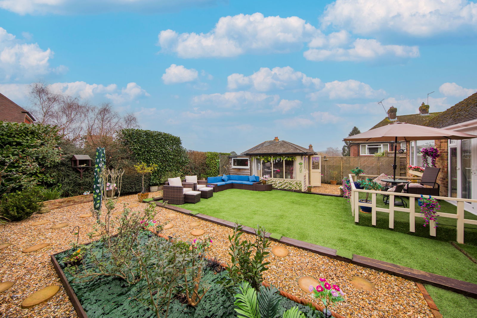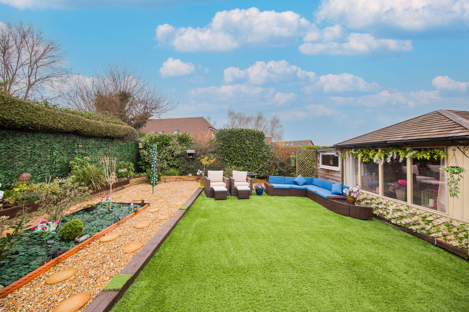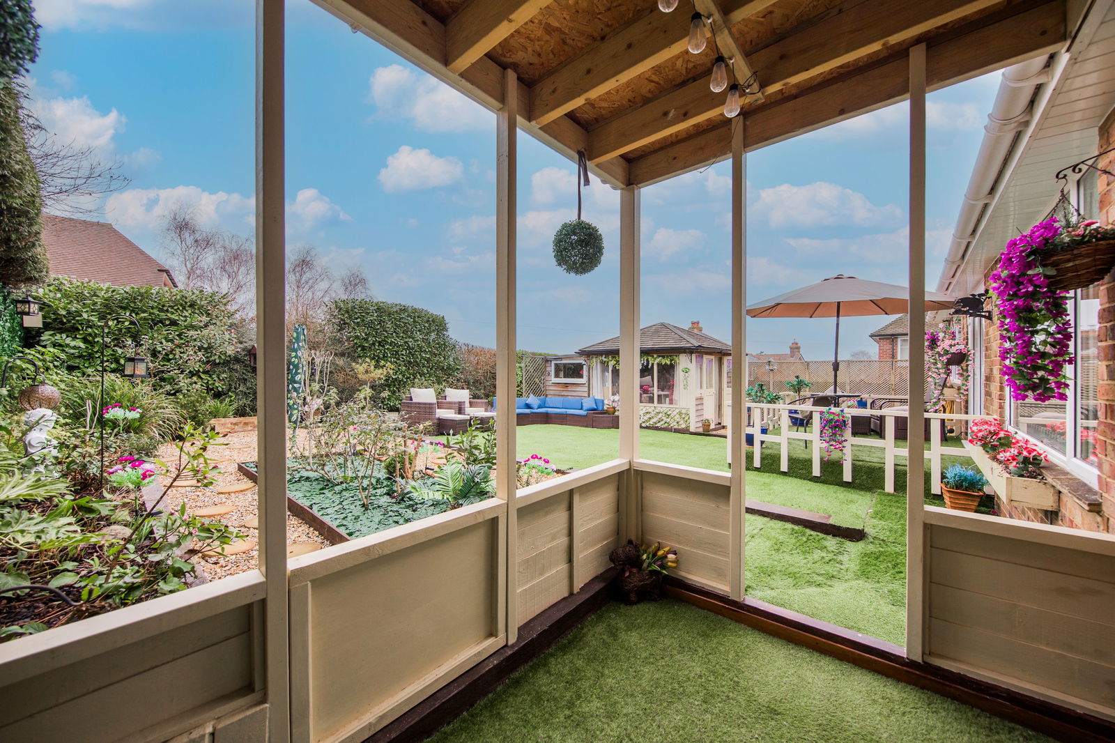 OUTSIDE: The front garden is mostly laid to lawn with flower and shrub borders plus driveway and paved path leading to the front door. To the rear is a beautifully maintained garden laid with Astro turf with flower and shrub borders, a pebbled seating area and wooden veranda outside the snug. There is a detached garden room with power plus attached workshop with power and storage. Further garden shed.