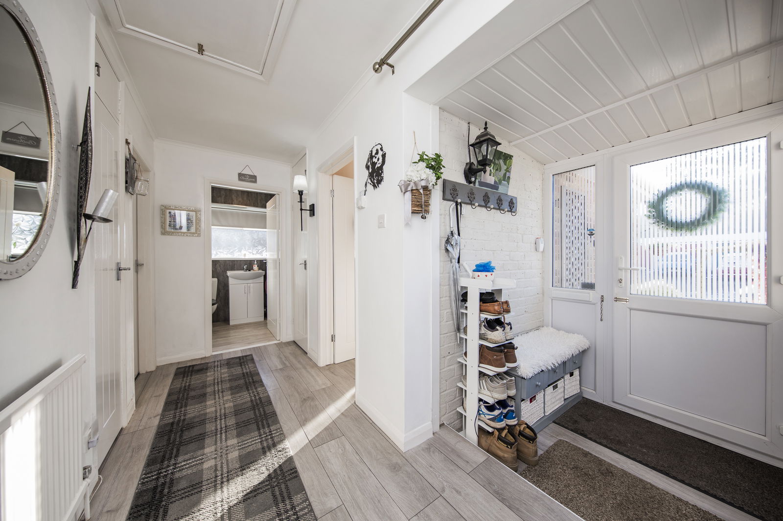 ENTRANCE HALL: Shelved storage cupboard. Access to airing cupboard housing hot water cylinder with slatted shelving above. Access to loft space. Wood effect flooring. Radiator. Range of doors to: