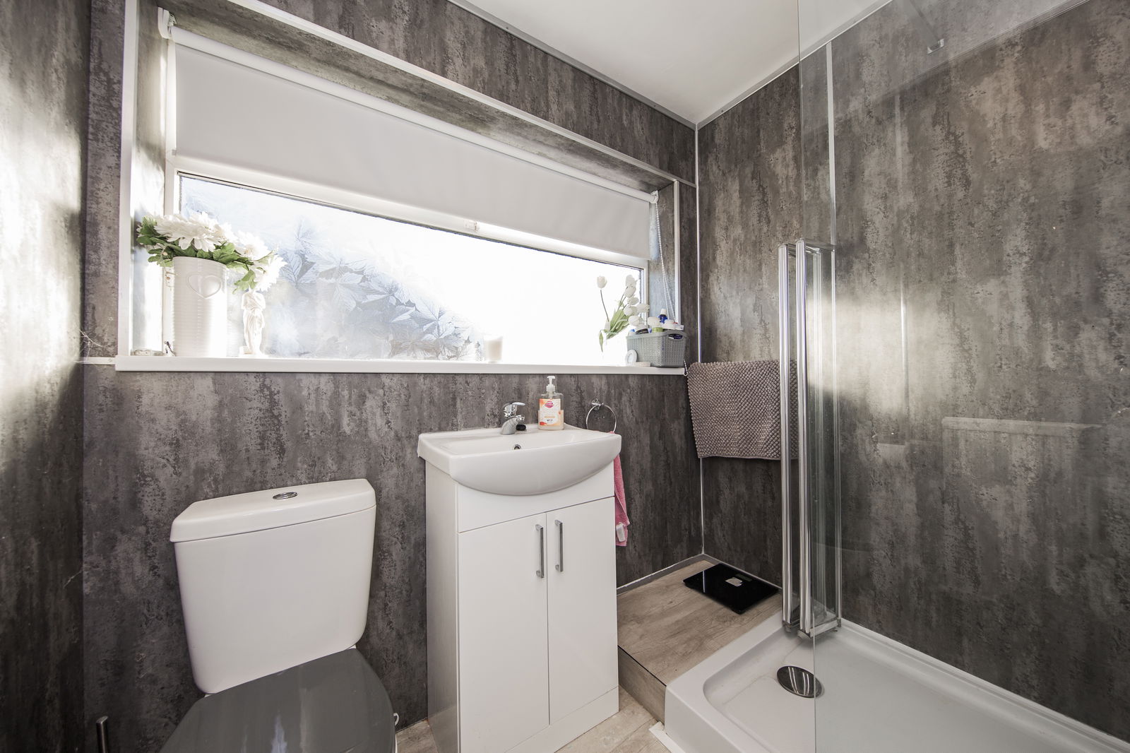 MODERN SHOWER ROOM: Obscured double glazed window. Wash basin. WC. Walk-in 'Triton' electric shower. Stone effect walls. Wood effect flooring. Radiator.