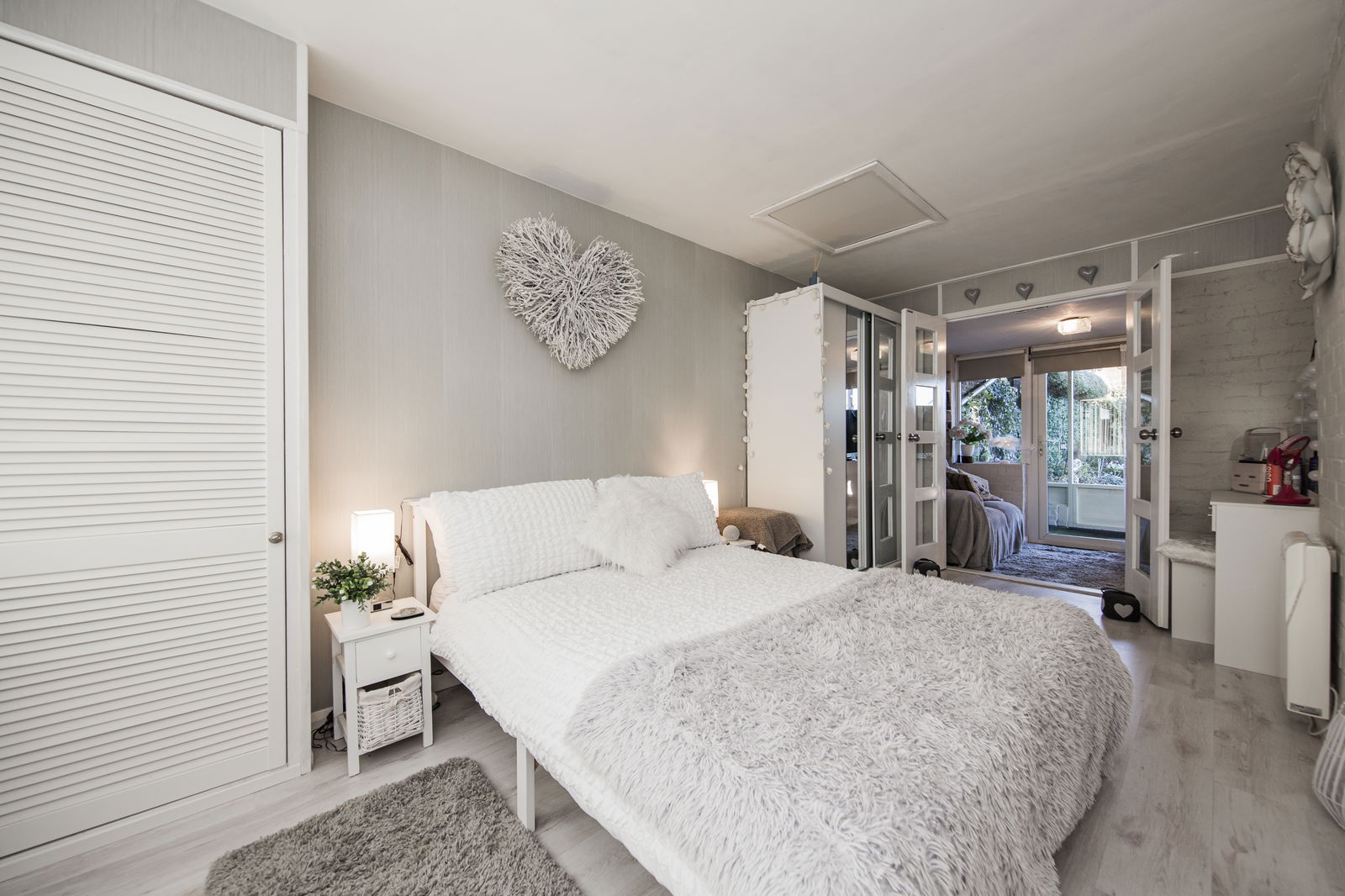 BEDROOM: Double glazed French door to raised patio area with Astro turf and double glazed window to side. Built in wardrobes. Wood effect flooring. Electric radiator.