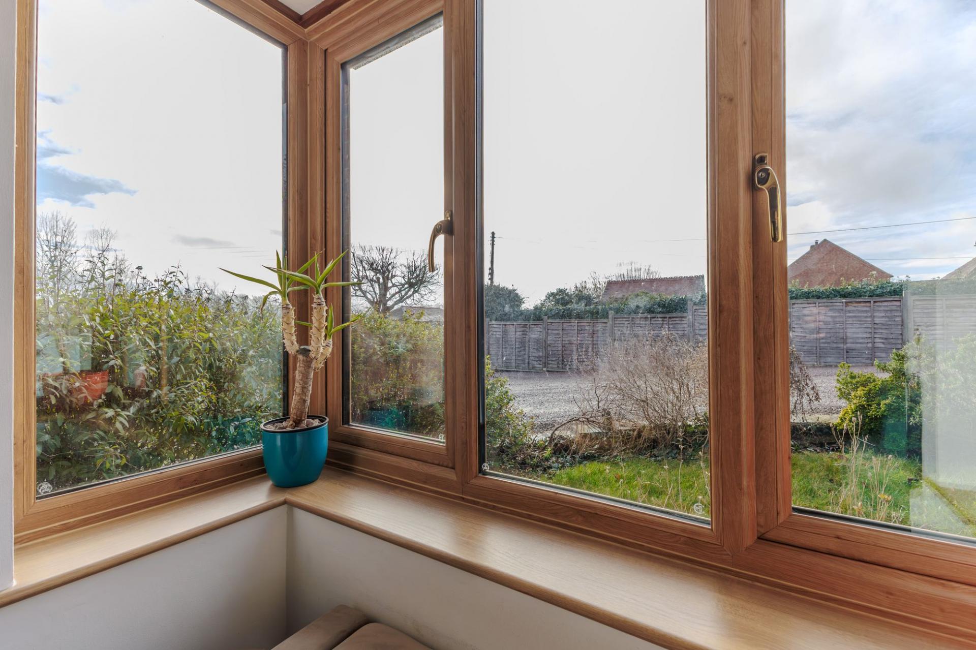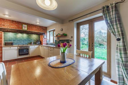 The light-filled lounge, where a feature log burner creates a warm and inviting atmosphere. The kitchen dining room is thoughtfully designed, offering ample space, with stylish cabinetry and contemporary fittings that complement the cottage’s character.