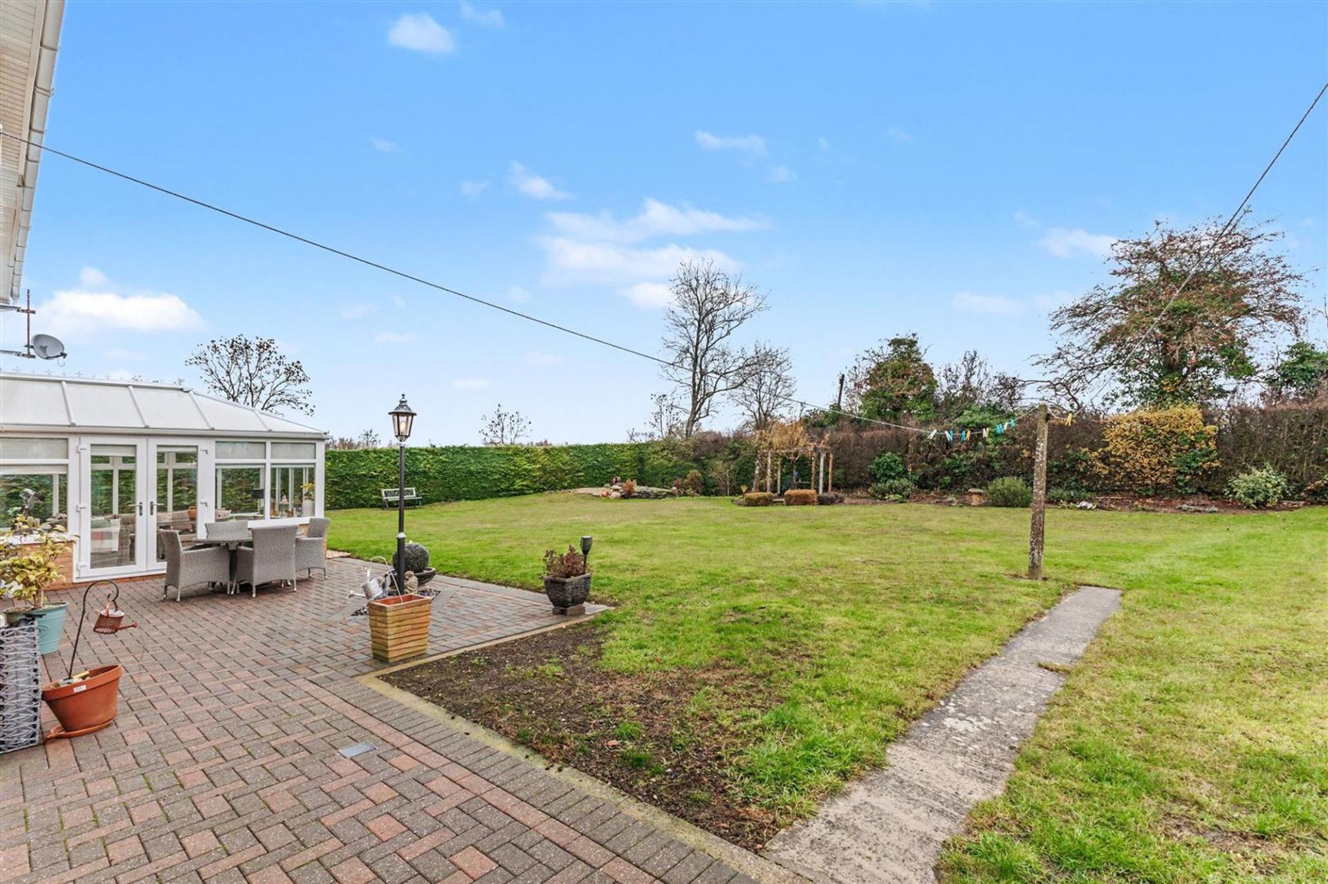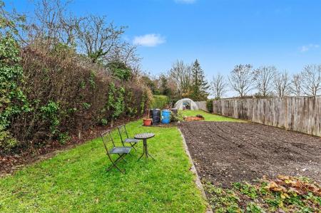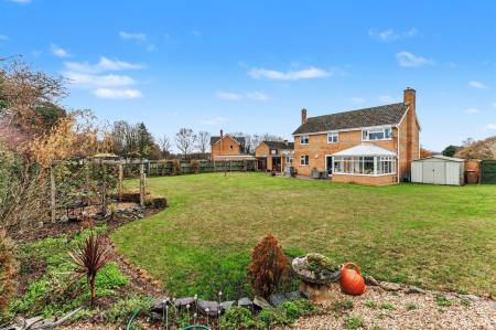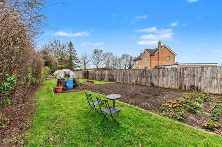 Externally, the property benefits from a substantial rear garden, predominantly laid to lawn, backing onto fields at the back. At the front, there is driveway parking and access to a single garage.