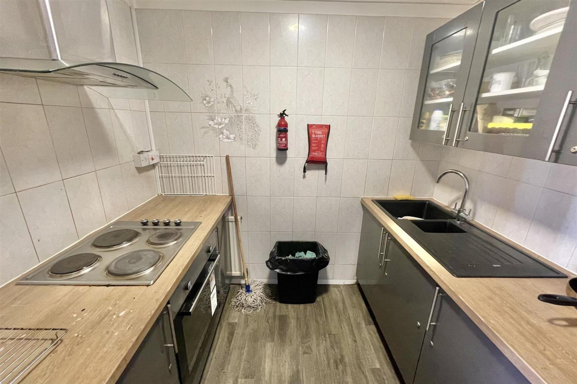 Upstairs, the first floor houses fourteen individual bedrooms, each with private en-suite facilities. This level also includes a communal kitchen, various utility rooms, store rooms, and three fire exits for safety compliance.