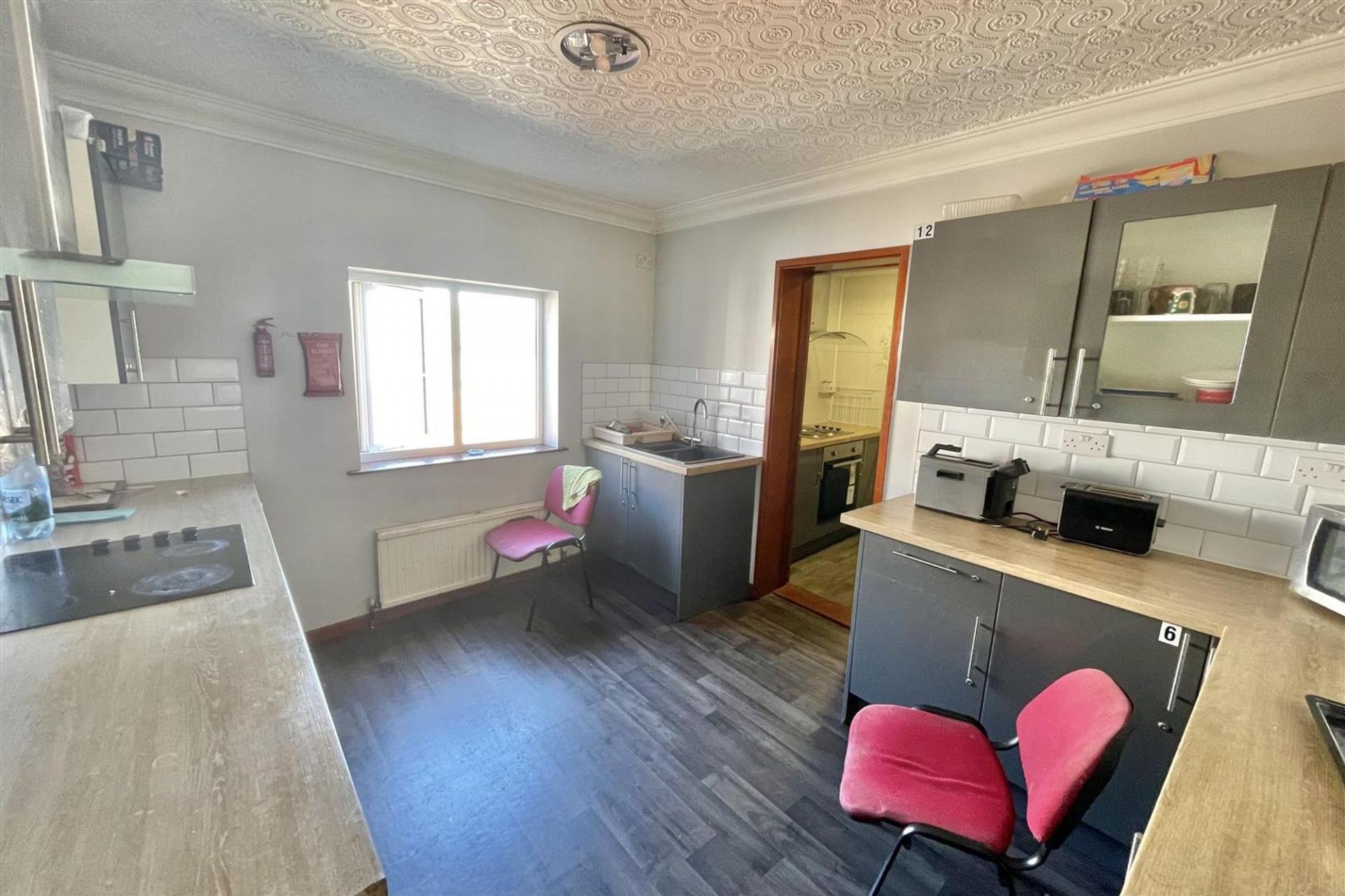 The ground floor comprises a shared lobby area, a communal kitchen, and two bedrooms, both with en-suite facilities. A standout feature of this floor is the exceptionally large space that once served as the hotel’s entertainment venue, restaurant, and dining room. This area still retains its original layout and includes guest toilet facilities. It presents an exciting opportunity for further conversion into additional accommodation, subject to necessary permissions.