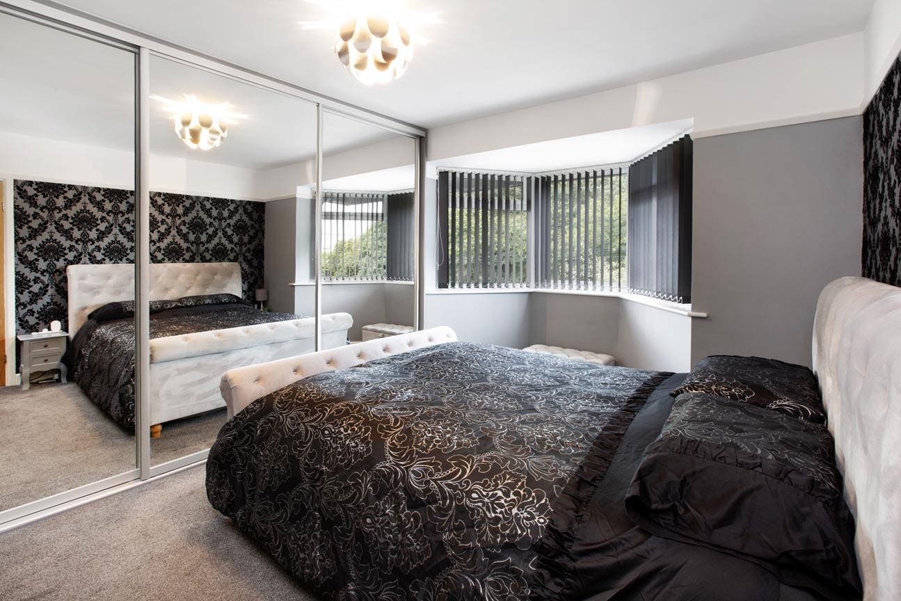 BEDROOM 1: uPVC double glazed bay window to the front, radiator and picture rail and fitted mirror fronted wardrobes to one wall.