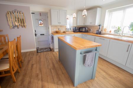 The accommodation comprises a spacious entrance hall, cloakroom, and a generous lounge featuring a built-in log burner with an attractive brick surround. The standout kitchen/dining room is fitted with a luxurious range of units, an island with integrated storage, and a full range of built-in appliances. An oil-fired boiler provides heating, and the property is maintained in excellent condition throughout.
