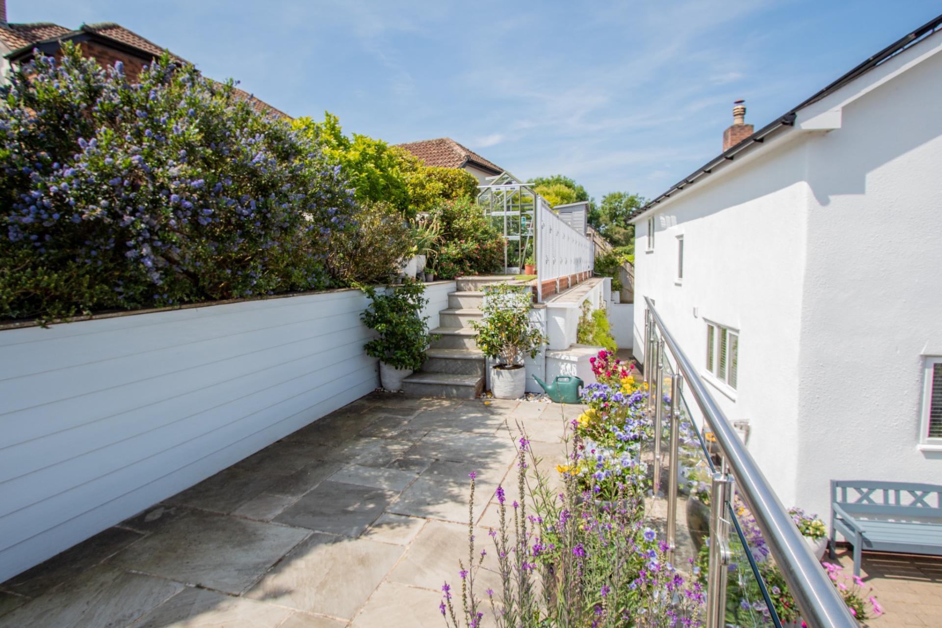 To the rear of the property is a single garage with an electric roller door, providing secure parking or additional storage. The landscaped garden has been thoughtfully designed by the current owners, featuring a beautiful Indian sandstone patio—perfect for outdoor dining or entertaining. Steps lead up to an elevated area enclosed by a sleek glass and stainless steel balustrade, adding a contemporary touch. The upper level also includes a greenhouse and garden shed, ideal for those with green fingers or in need of extra storage.