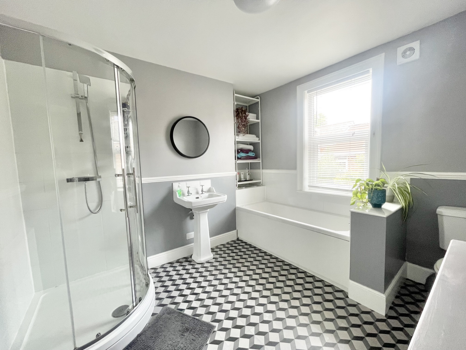 BATHROOM: Close coupled WC, wash hand basin, shower cubicle with shower over, panelled bath, radiator, double glazed window to the rear.