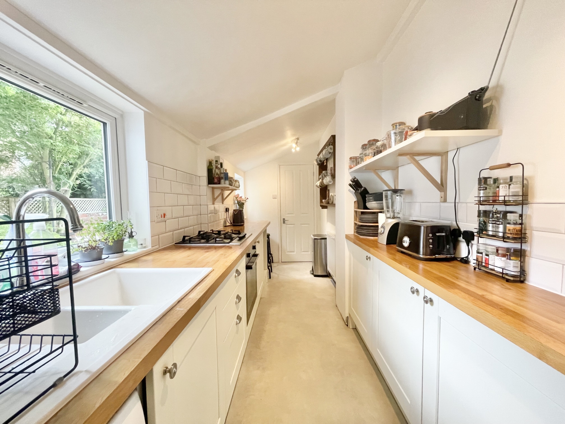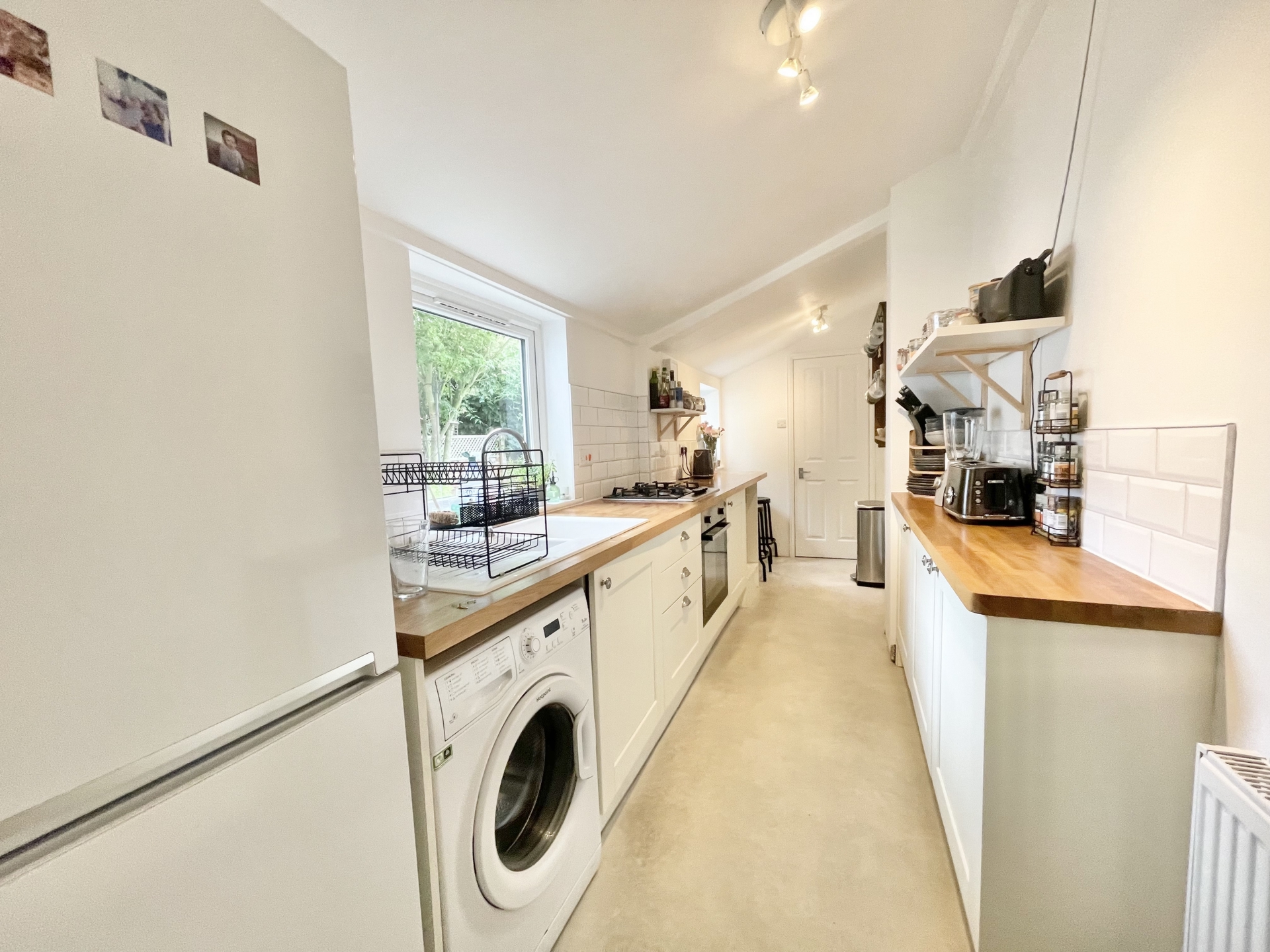 KITCHEN: 5.4m x 1.8m (17'9" x 5'11"), Base cupboards and drawers with worktop over, sink and drainer, built in oven and four ring gas hob, space for fridge freezer, space for washing machine, radiators, double glazed window to the side, door to..