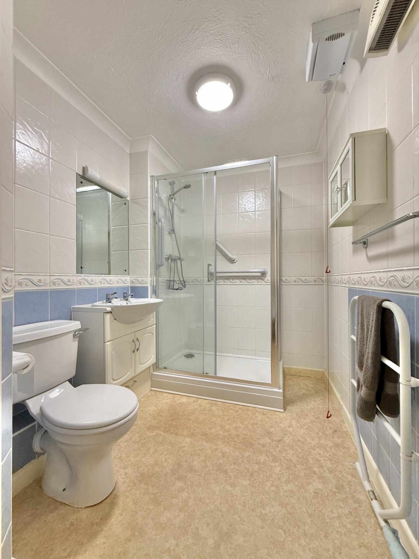 SHOWER ROOM: Close coupled WC, wash hand basin, shower cubicle, security pull chord, airing cupboard housing hot water tank.