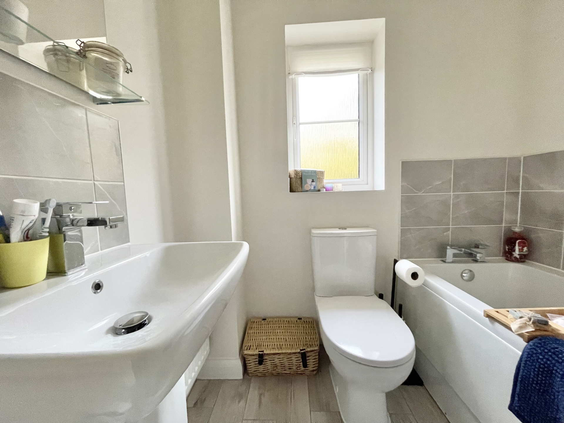 BATHROOM: Close coupled WC, wash hand basin, paneled bath, radiator, obscure double glazed window to the front.