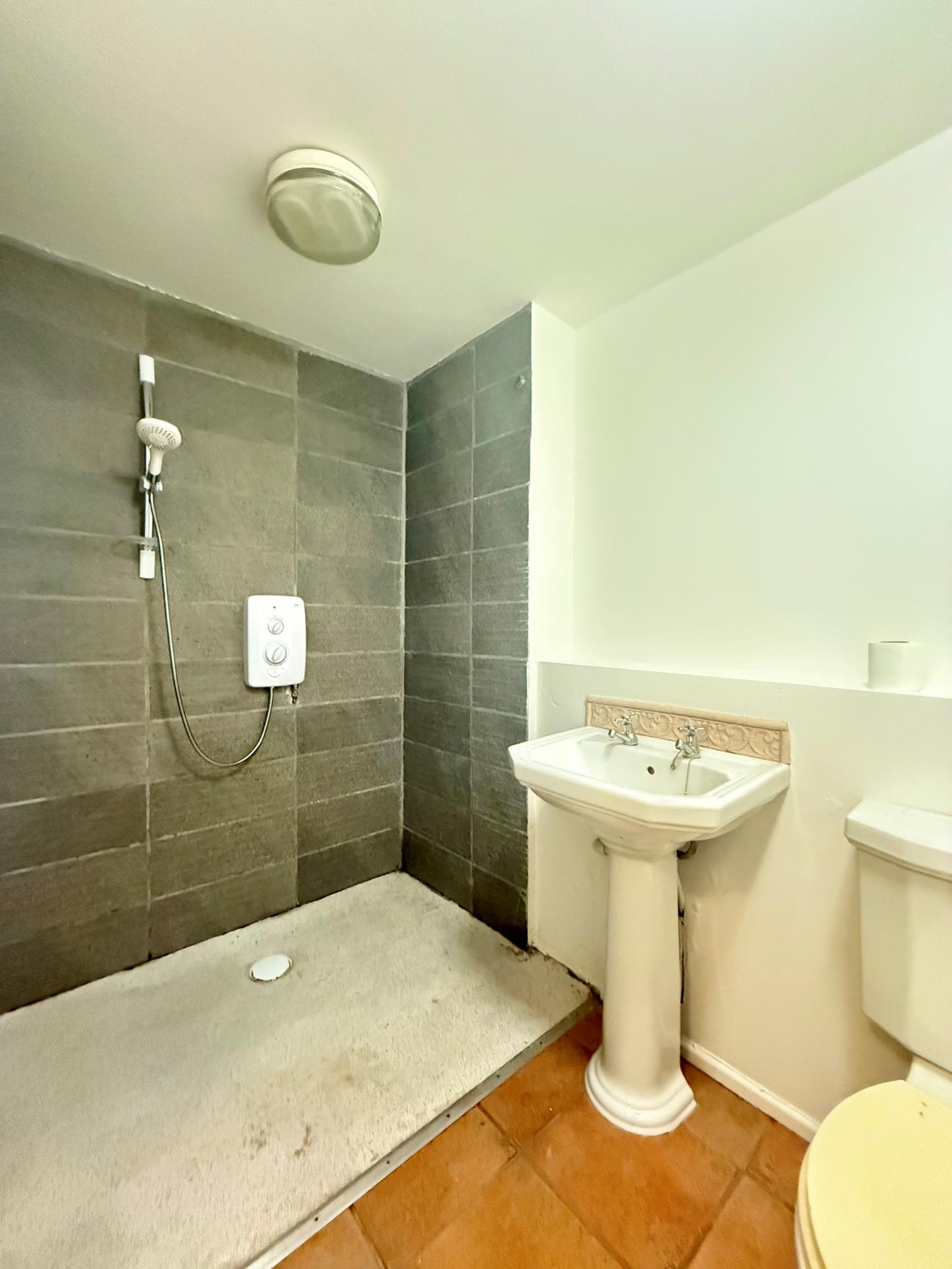 WET ROOM: Close coupled WC, pedestal wash hand basin, walk in area with wall mounted shower, radiator.