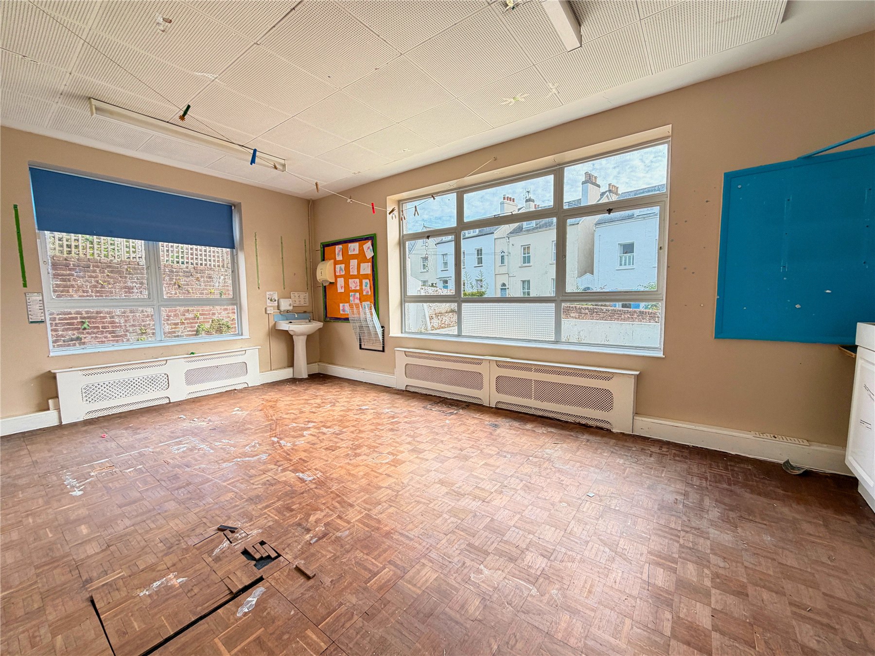 A wide stair leads up to a large first floor landing which is currently laid out as three classrooms/nursery rooms which could be designed to create office space or 3 to 4 potential bedrooms and bathrooms. Each room is light with large windows and a pleasant St Leonards outlooks.