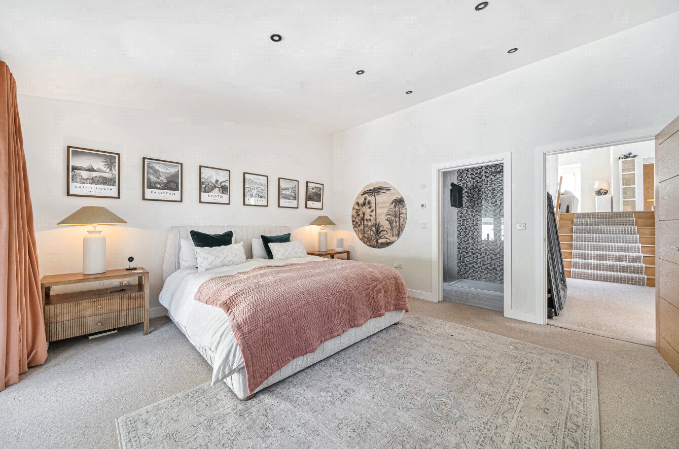 Accessed by handcrafted oak stairs, the master suite feels like a private retreat. Patio doors open onto a sun terrace overlooking the gardens, perfect for a morning coffee, while the luxury en-suite adds a touch of indulgence. Three further double bedrooms (one currently used as a second living space) and a stylish four-piece family bathroom complete the generous accommodation.
