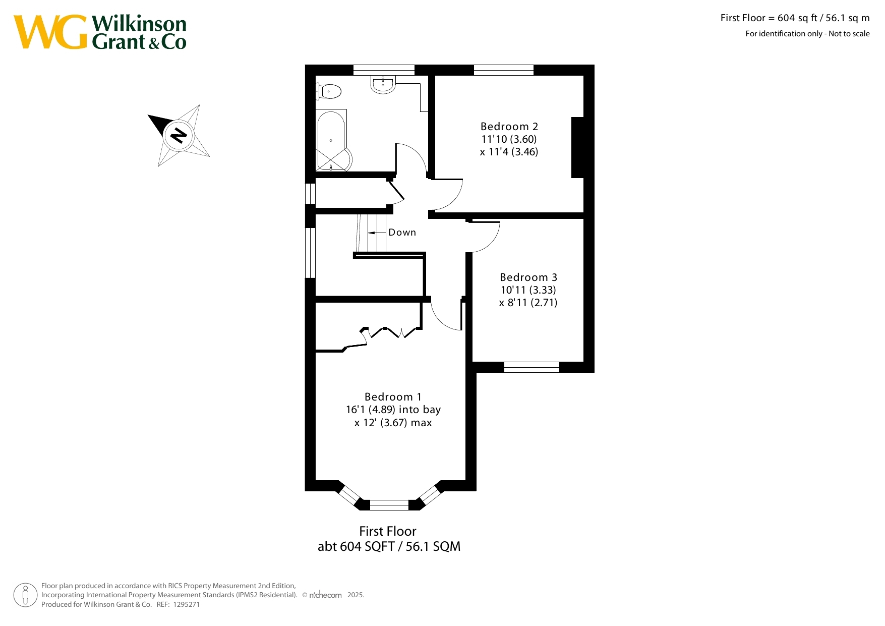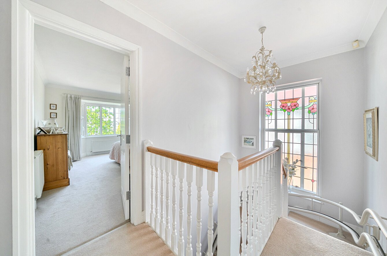 Upstairs, three generous double bedrooms include a lovely bay-fronted principal room with fitted wardrobes and a sunny southerly aspect. Bedroom Two is a great size and enjoys garden views, while Bedroom Three offers excellent versatility as a nursery or home office. The family bathroom is finished in elegant grey tiling with decorative detailing and comprises a bath with overhead shower, WC and vanity basin.