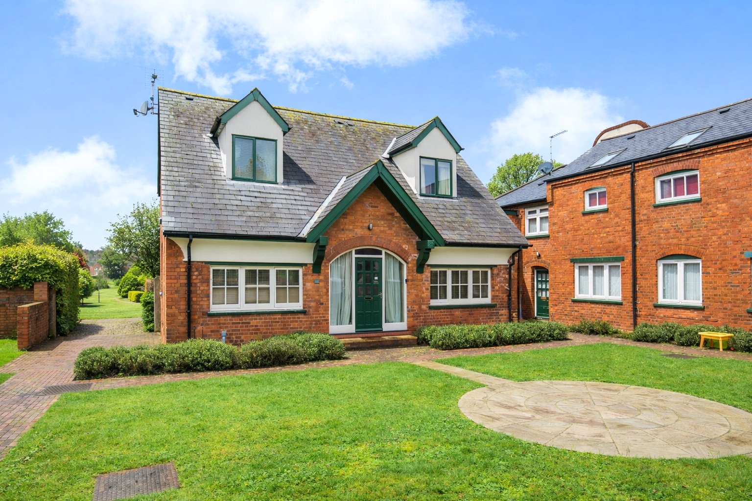 The kitchen-dining area opens directly onto a private, enclosed garden. To the front of the property are neatly maintained communal gardens, offering shared outdoor space with no maintenance responsibility.