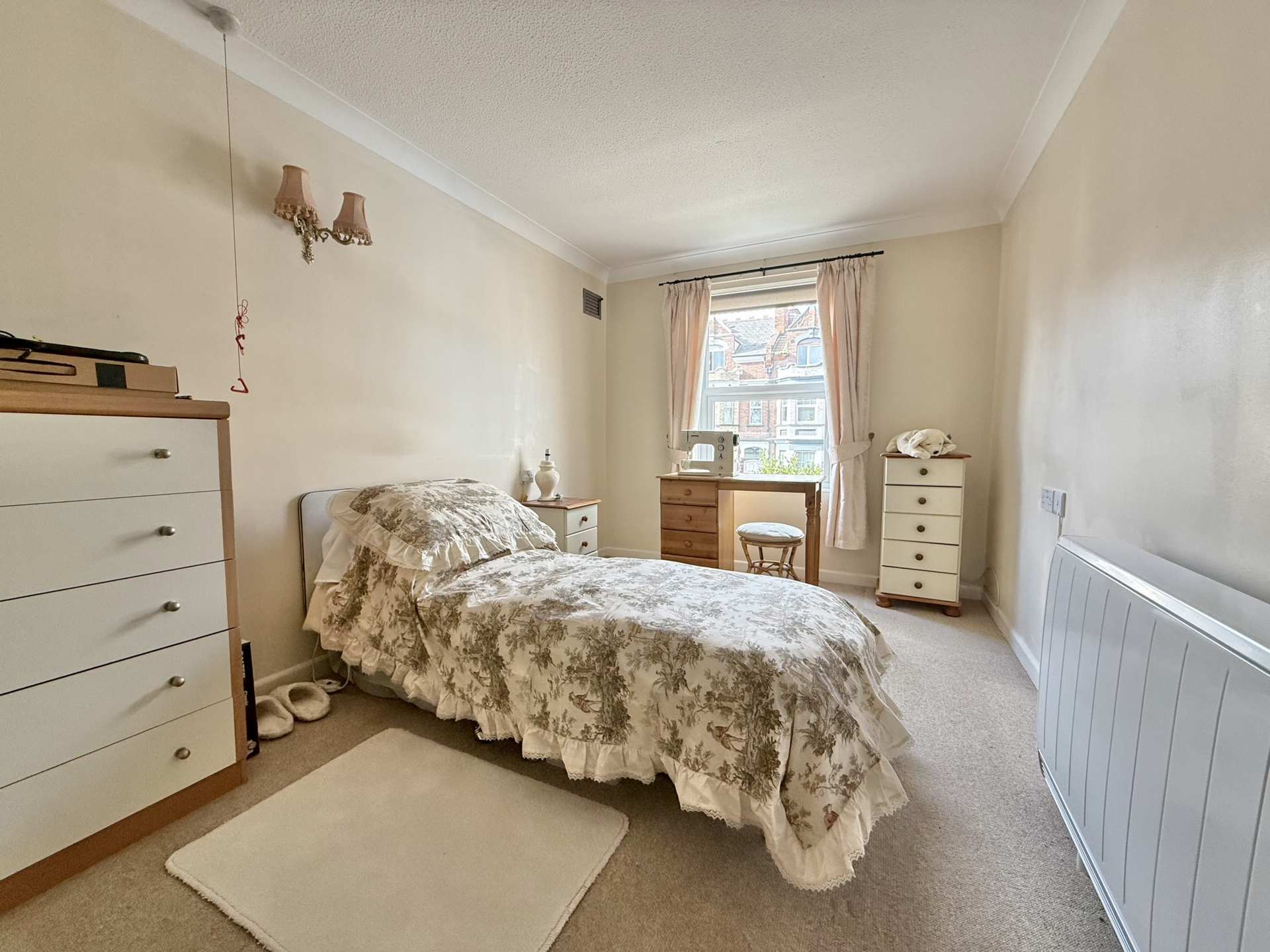 BEDROOM: 4.6m x 2.7m (15'1" x 8'10"), Double glazed window to the front, electric heater, built in wardrobe, pull cord.