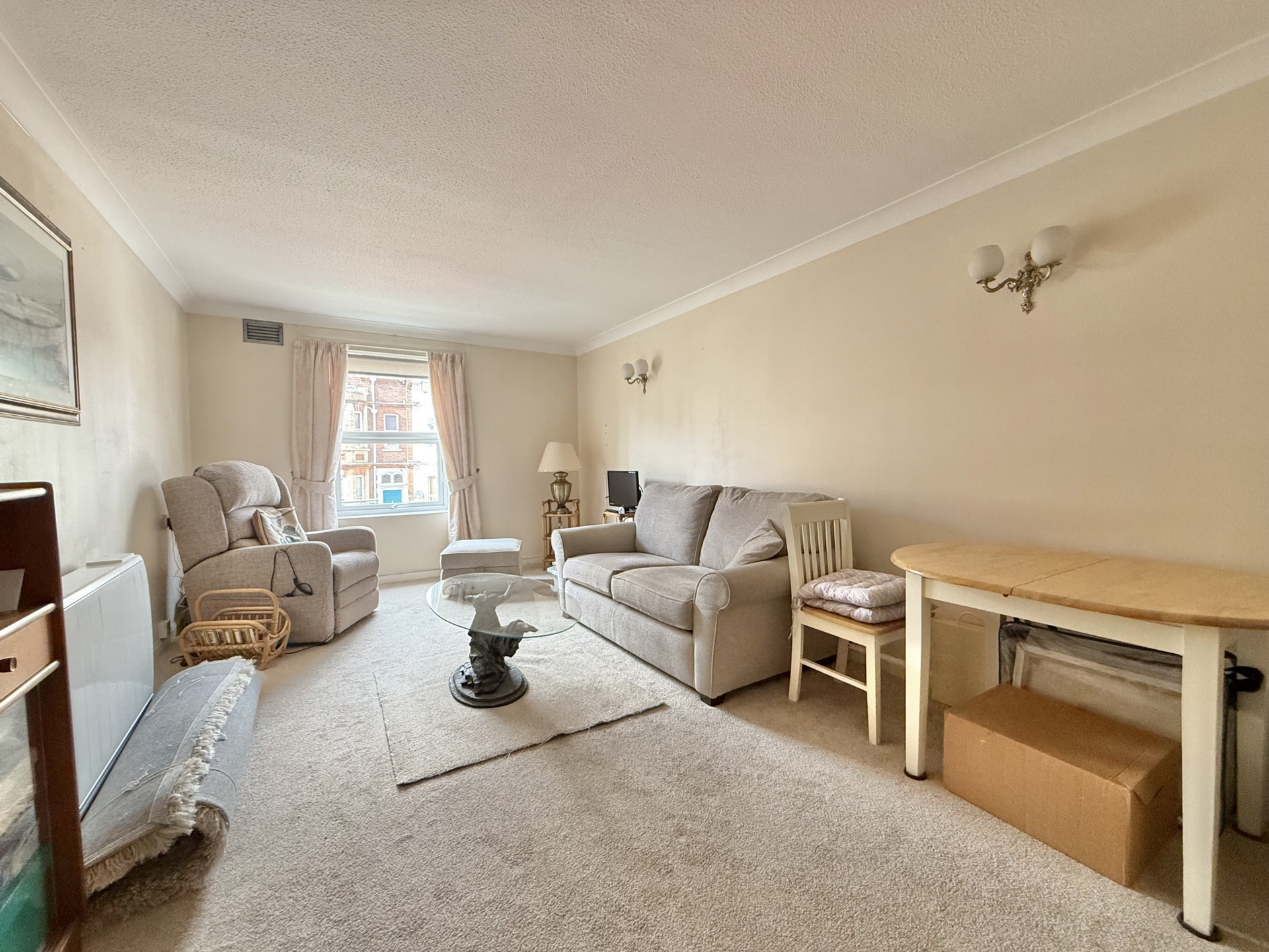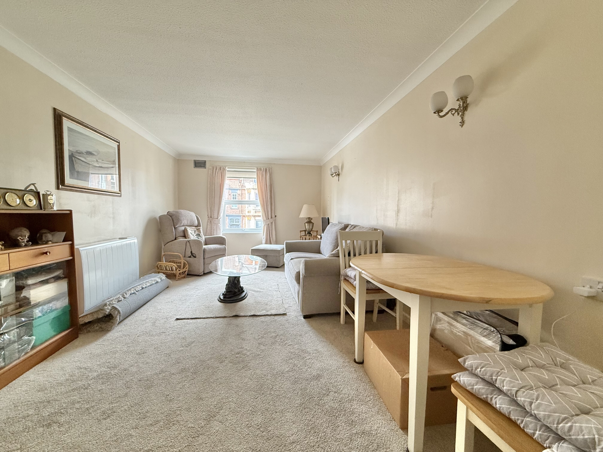 LOUNGE: 5.6m x 3.2m (18'4" x 10'6"), Double glazed window to the front, electric heater, pull cord, opening to.