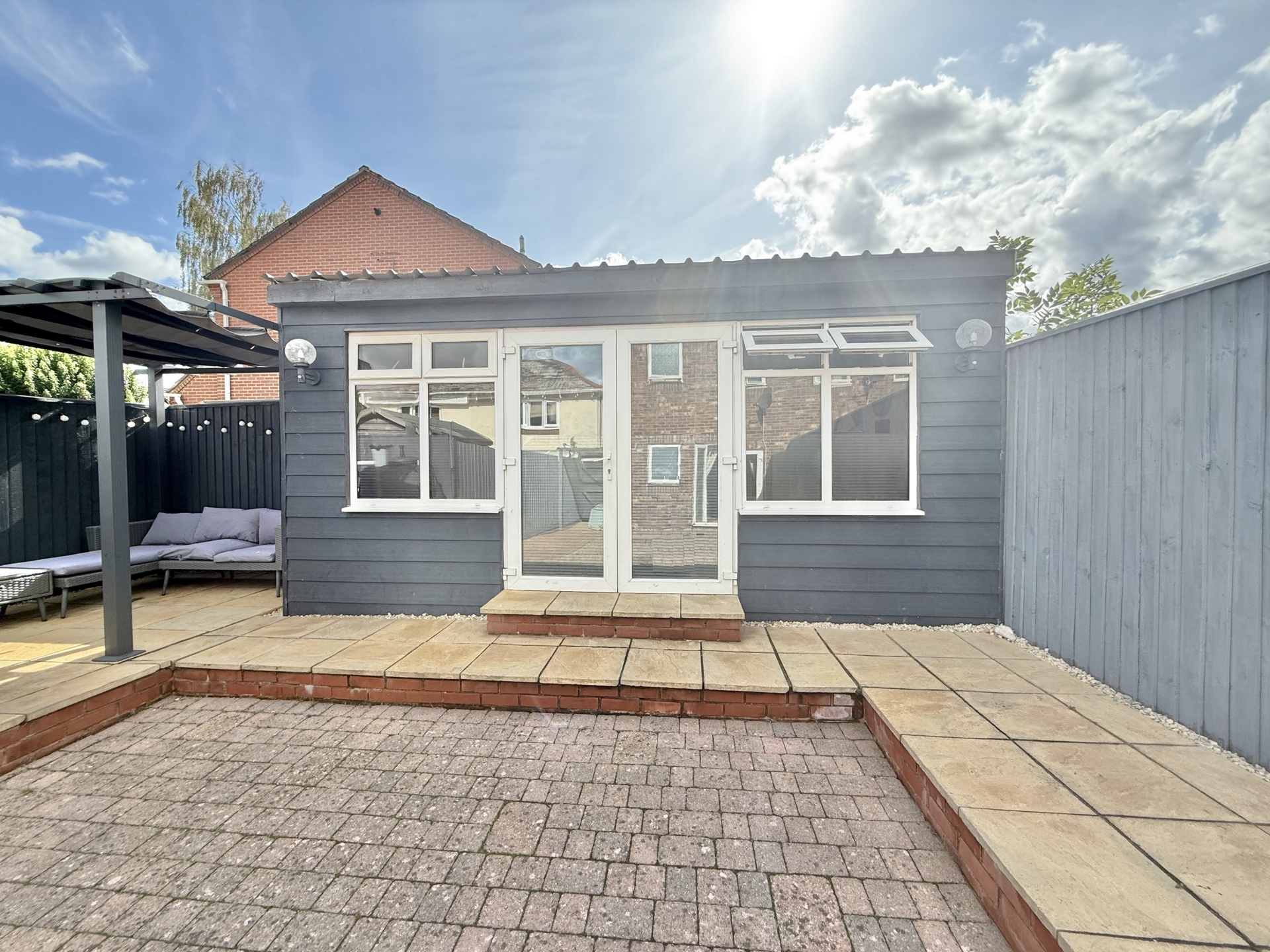 OUTSIDE: A side gate provides convenient access to the rear of the property, where the garden stands out as a key feature. Thoughtfully designed for low maintenance, the space is attractively paved and includes a dedicated seating area-ideal for outdoor dining or relaxation. From here, you’ll also find direct access to the Home Office, offering a perfect blend of work and leisure. A rear gate leads to the property's allocated parking space, conveniently accessed via Lichgate Road.
