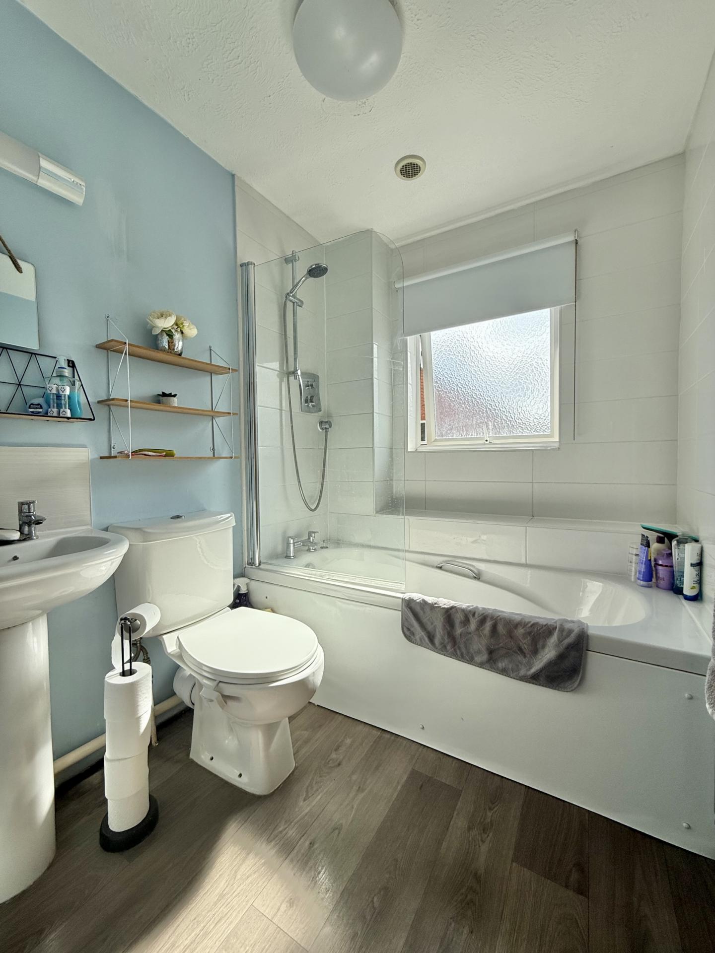 BATHROOM: Suite comprising close coupled WC, pedestal wash hand basin, panelled bath with shower over, double glazed window to the rear, towel rail.