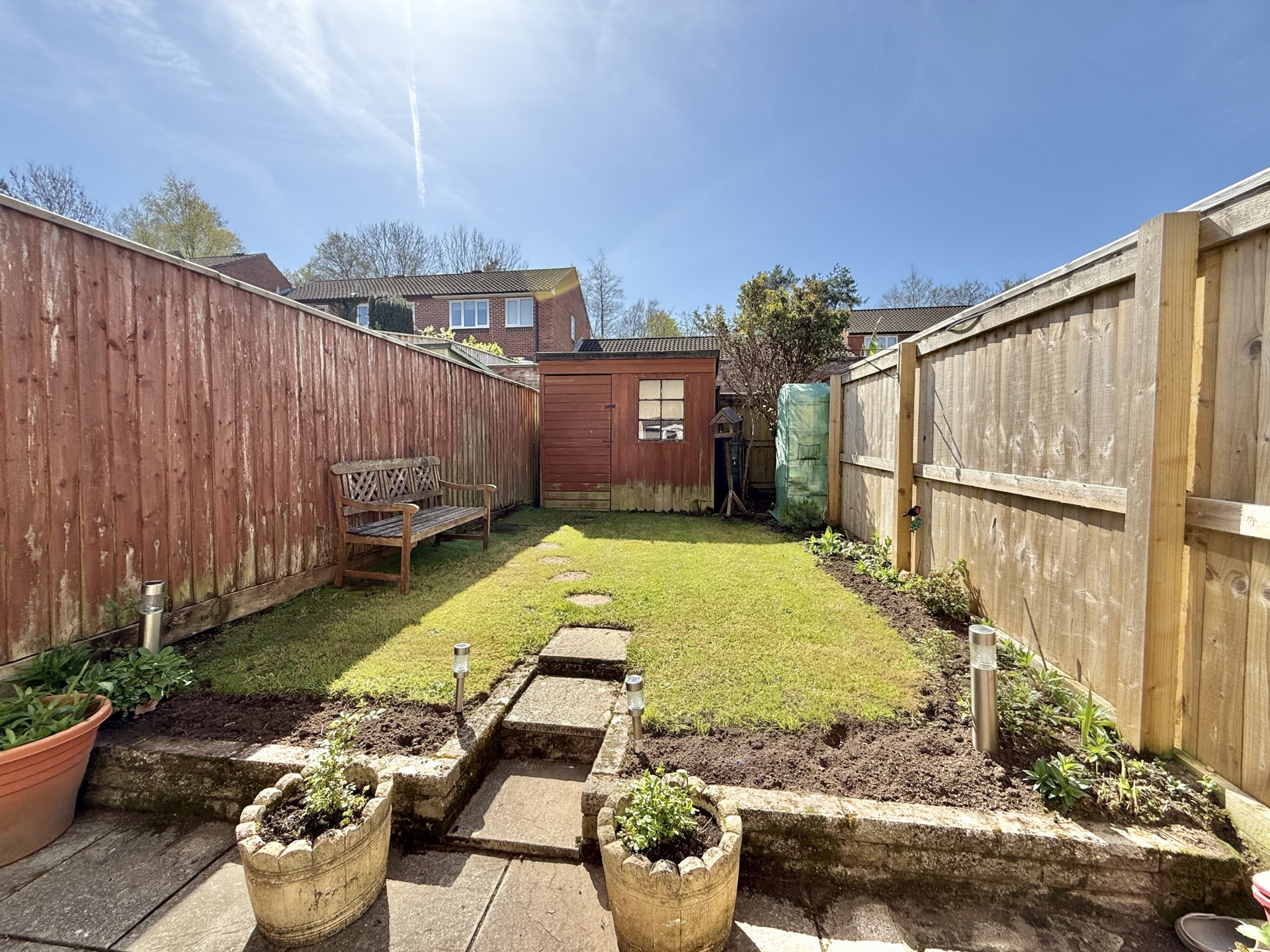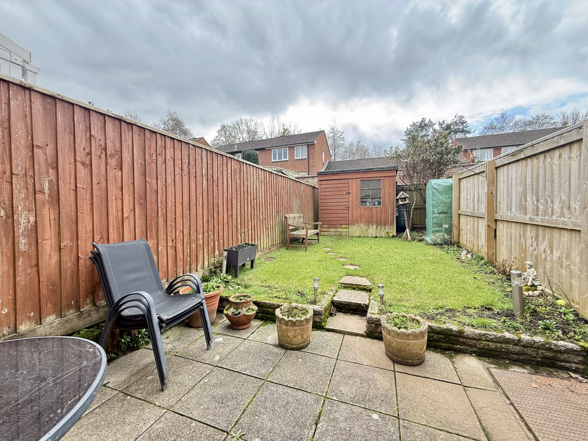 OUTSIDE: To the rear of the property is an enclosed garden laid to paved patio with grass lawn and handy timber storage shed.
