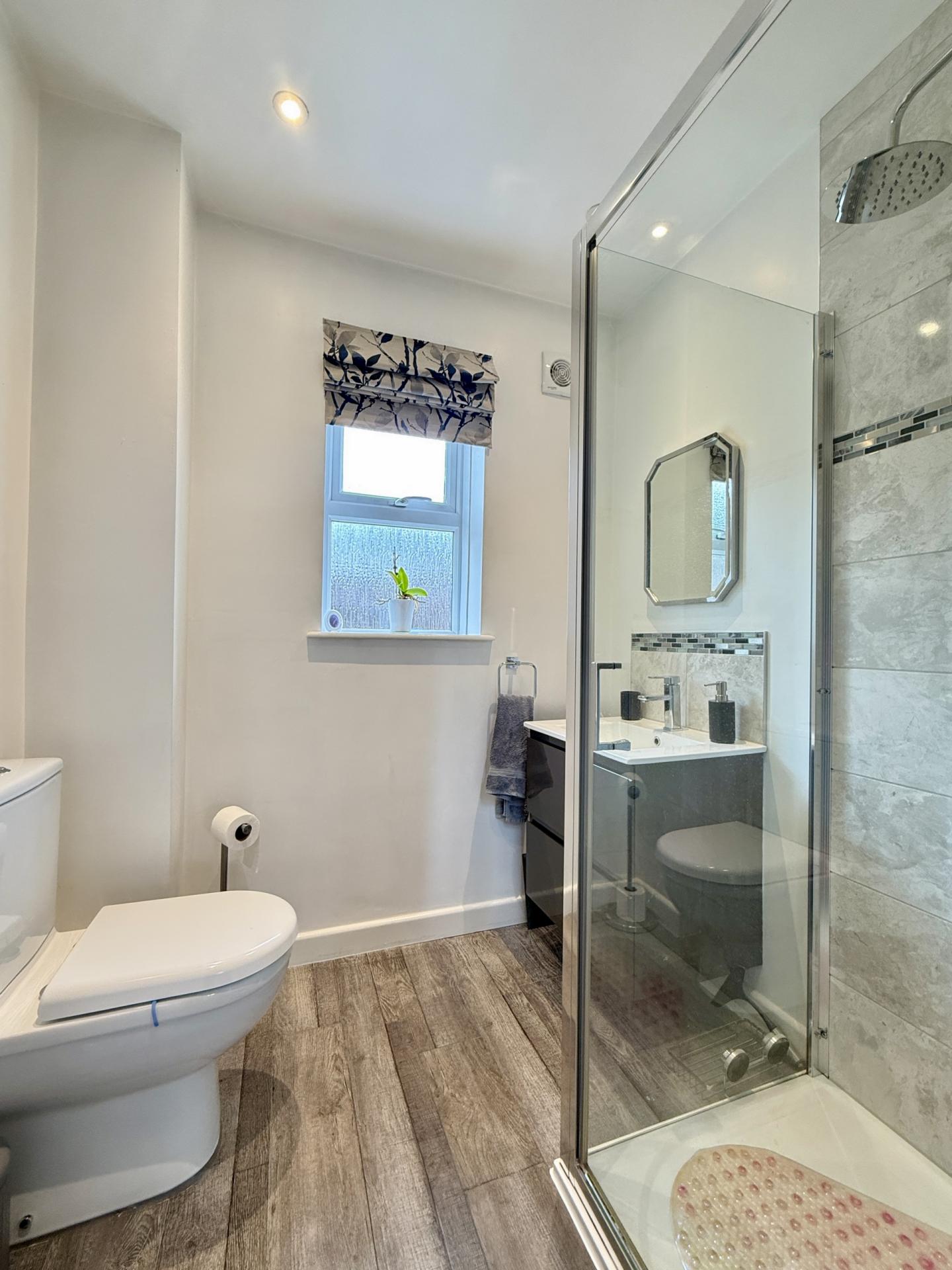 SHOWER ROOM: Close coupled WC, wash hand basin with storage cupboard under, shower cubicle, radiator, double glazed window to the rear.