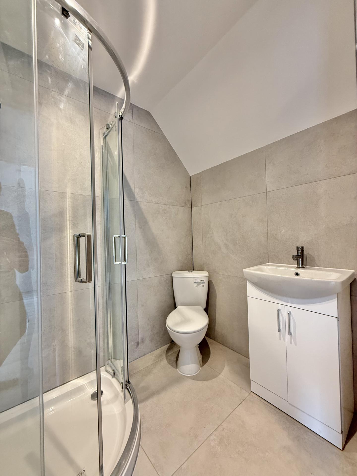 SHOWER ROOM: Shower cubicle, close coupled WC, wash hand basin, radiator.