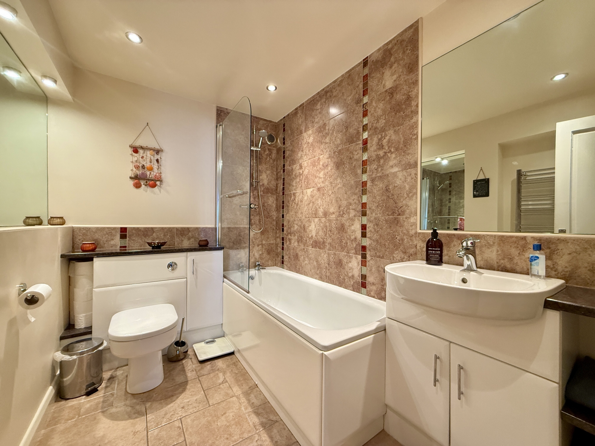 BATHROOM: Wash hand basin, pabnelled bath with shower over, WC with concealed cistern, radiator.