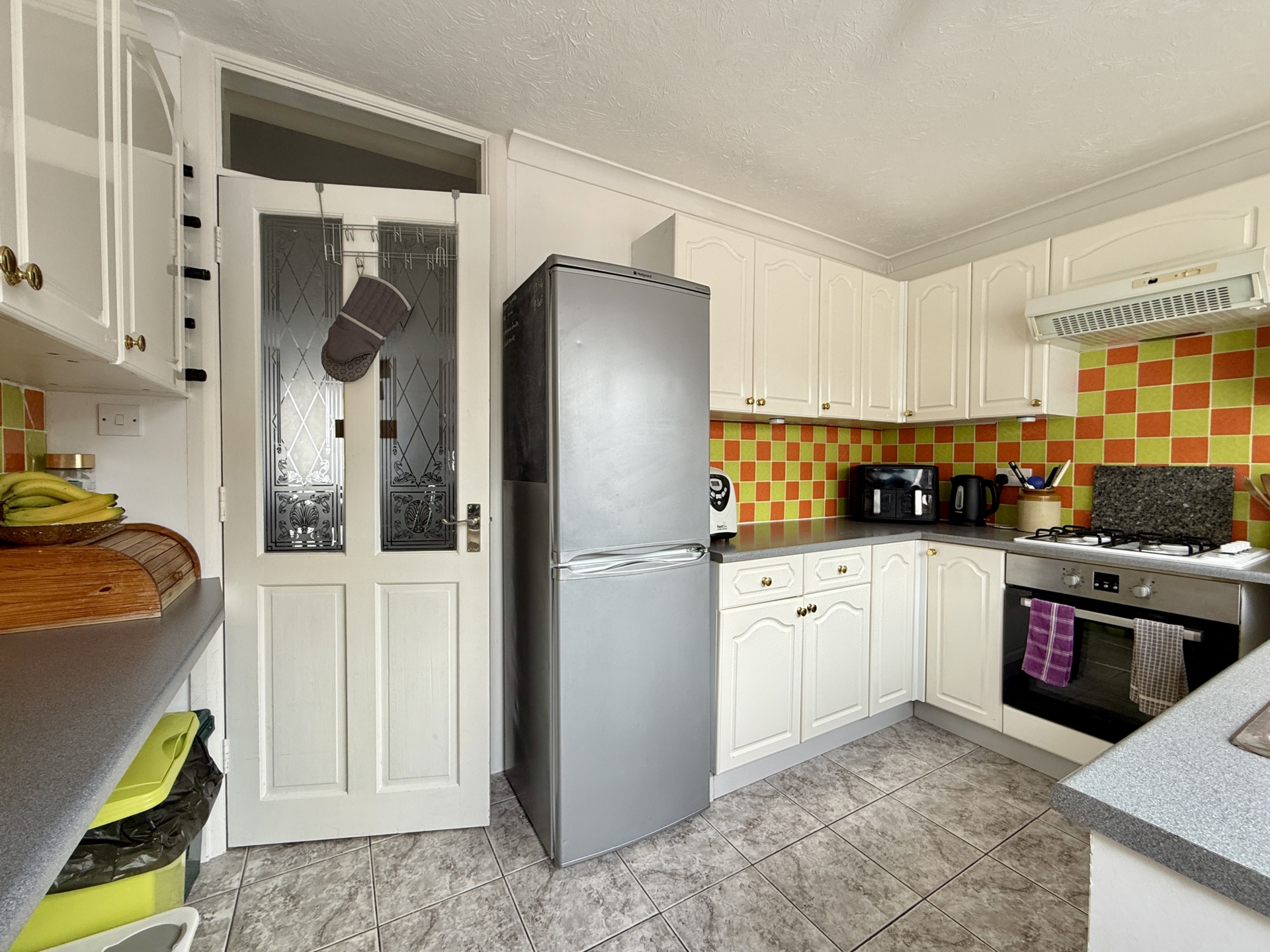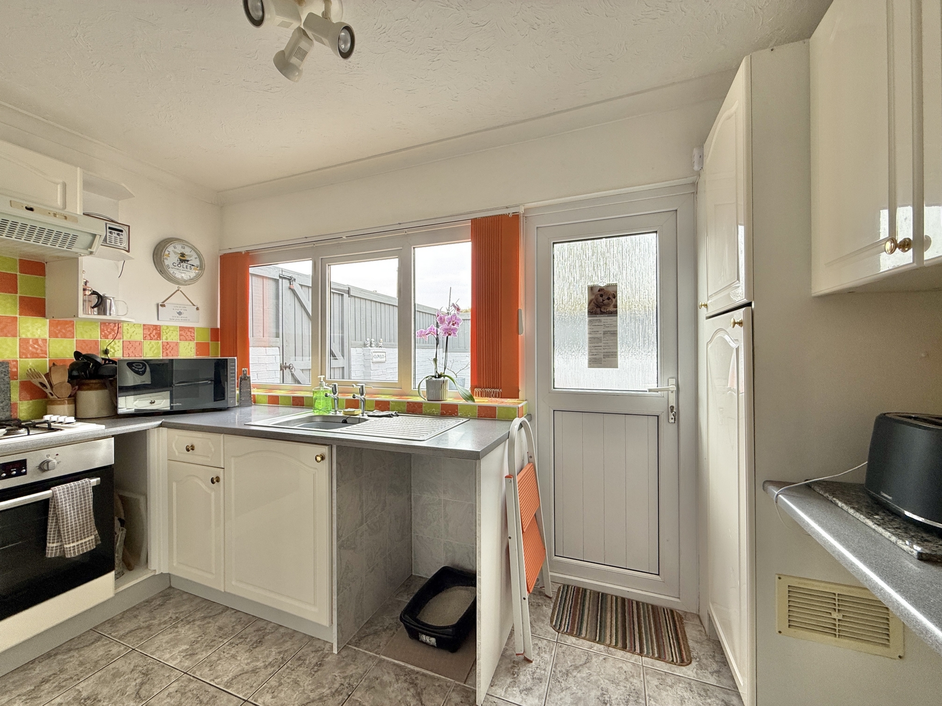 KITCHEN: 3.5m x 2.4m (11'6" x 7'10"), Base cupboards and drawers with worktop over, built in oven and hob with extractor over, sink and drainer, space for fridge freezer, wall mounted cupboards, double glazed window to the rear, double glazed door to the rear.