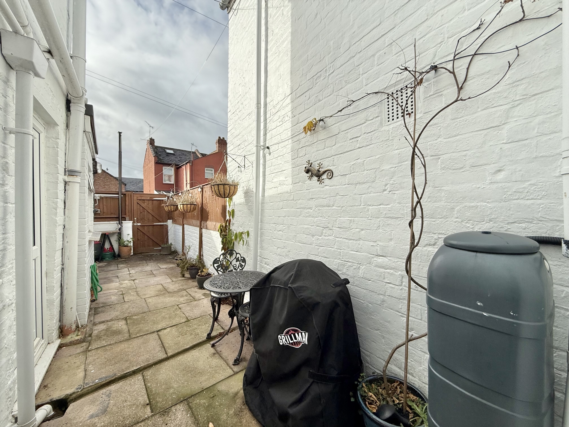 OUTSIDE: To the rear of the property is an enclosed courtyard garden laid to patio with handy timber storage shed.