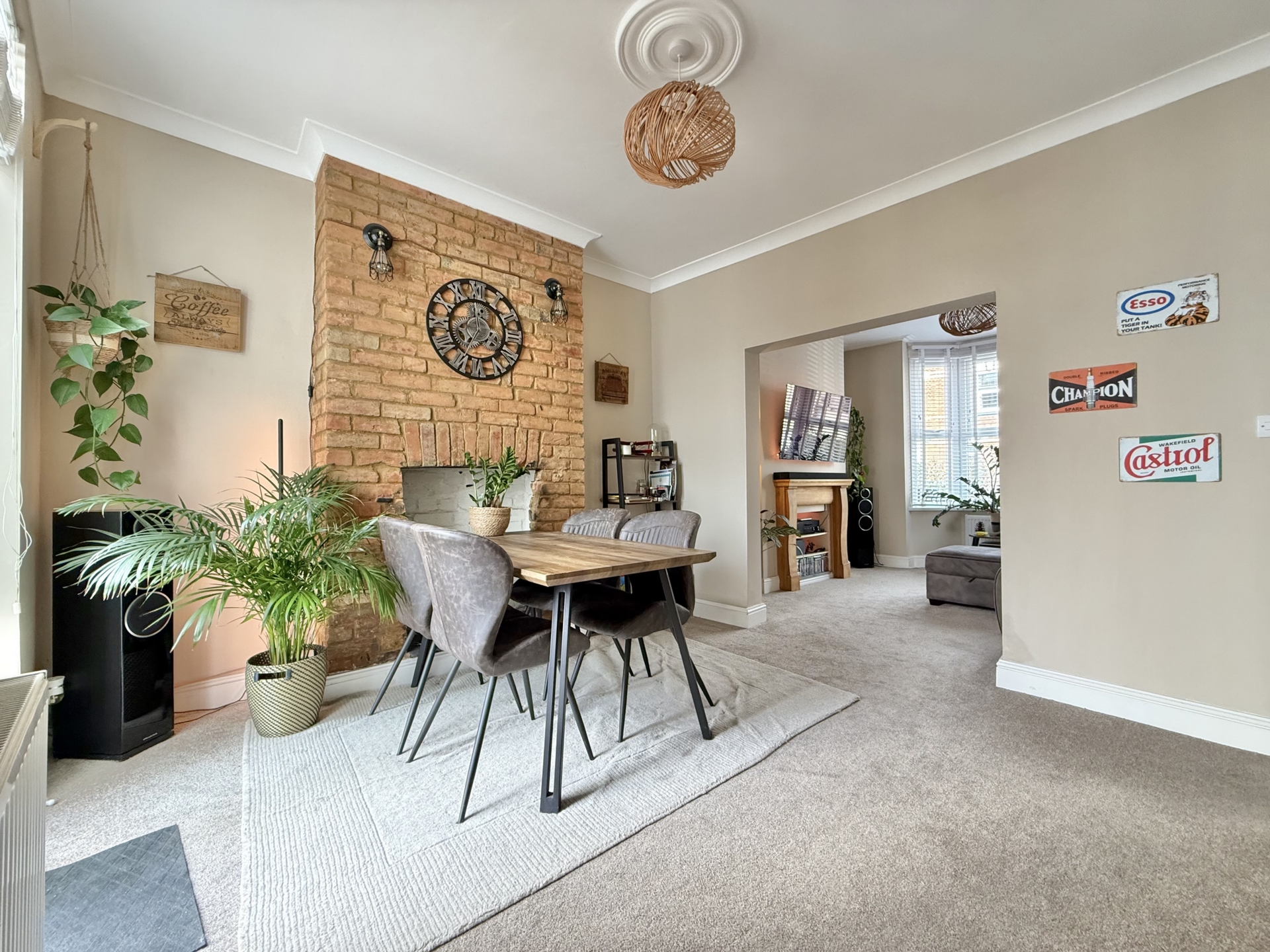 DINING ROOM: 4.3m x 3.3m (14'1" x 10'10") Maximum, Stairs to first floor landng with storgae cupboard under, radiator, exposed brick chimney brest, double glazed doors to the rear garden.