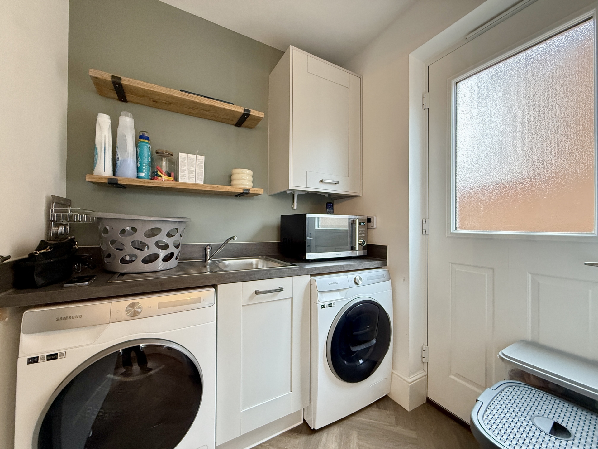 UTILITY: 1.8m x 1.8m (5'11" x 5'11"), Door to the side, cupboard housing boiler, sink and drainer, space for washing machine and tumble dryer.