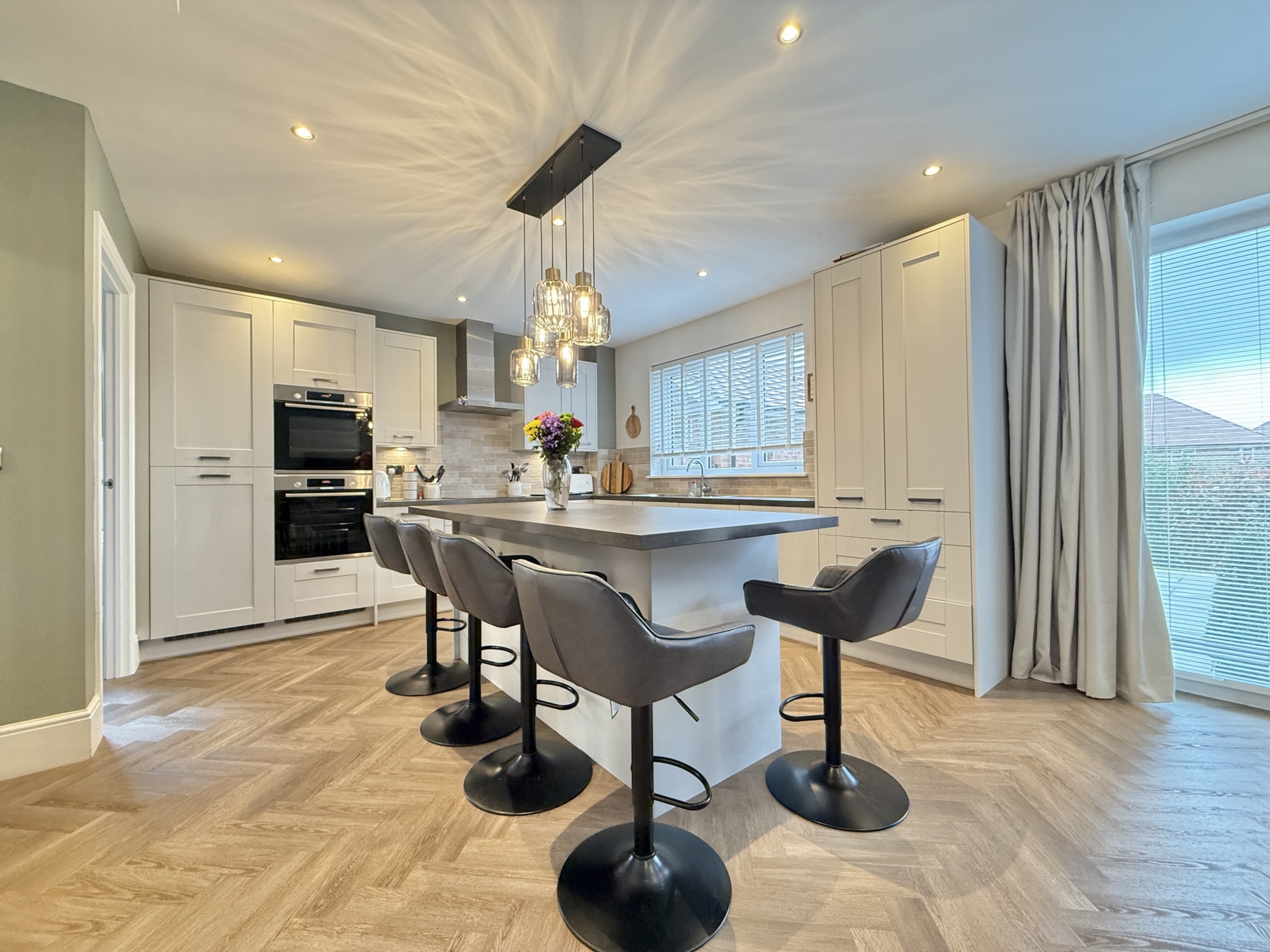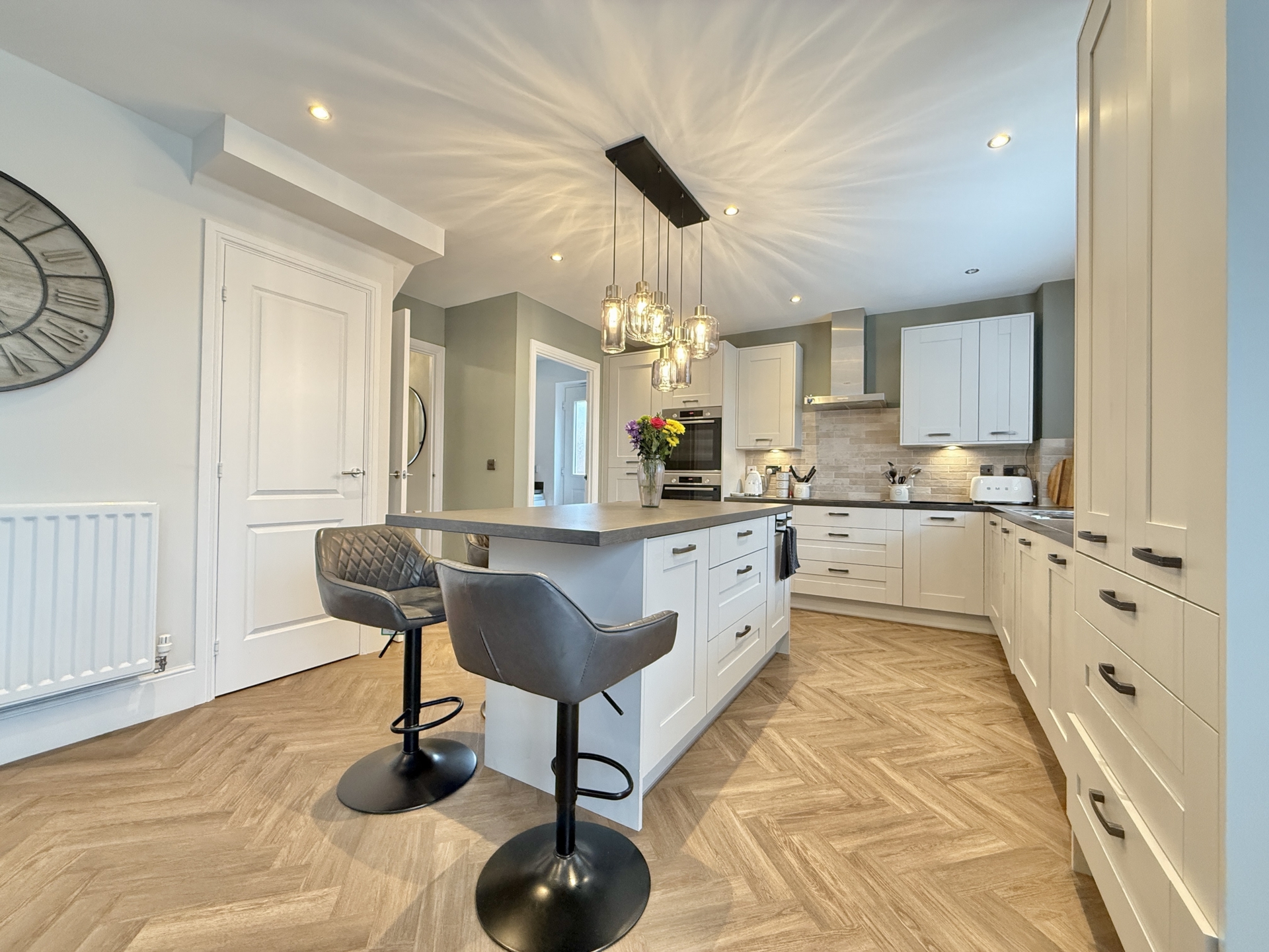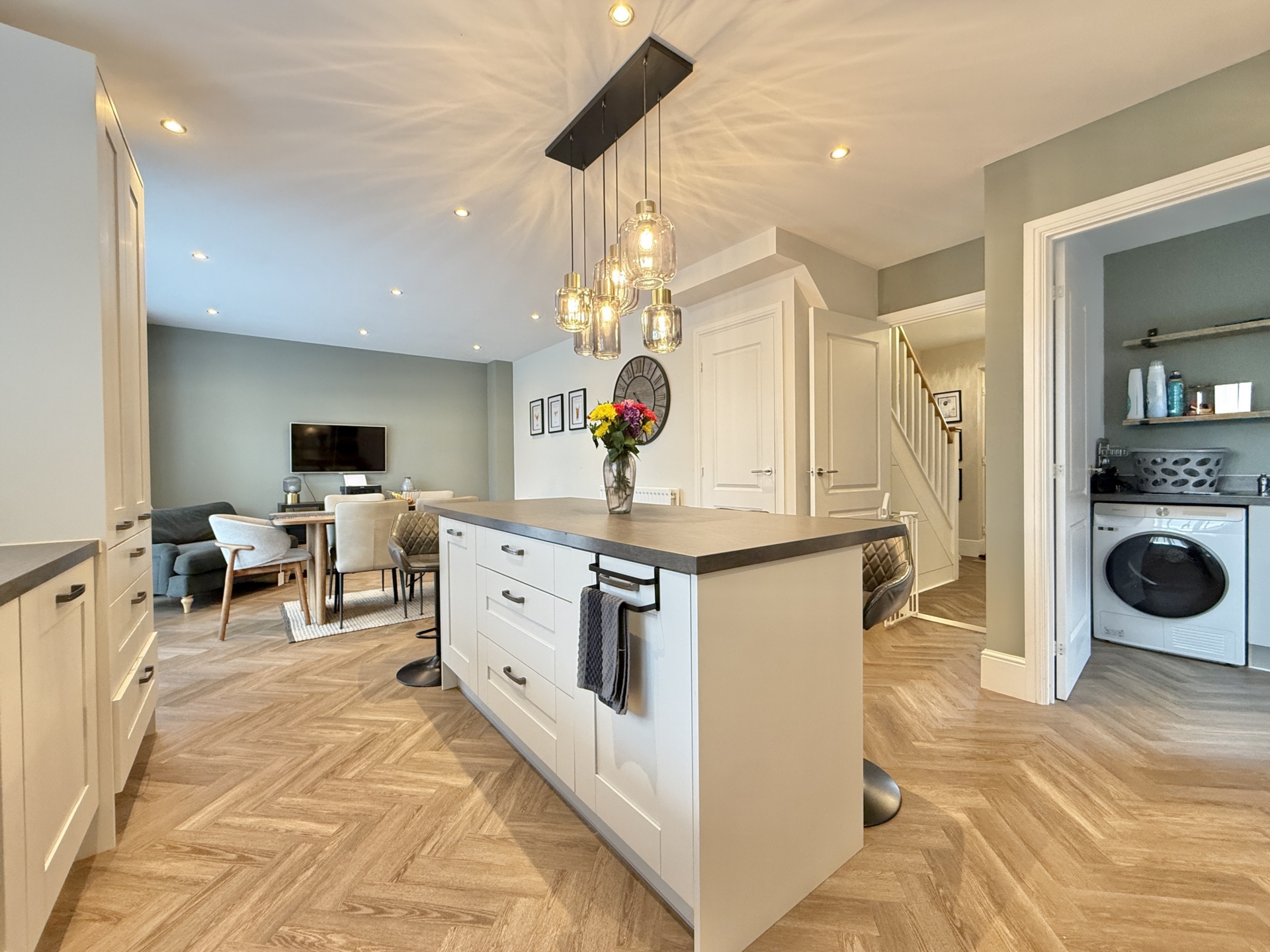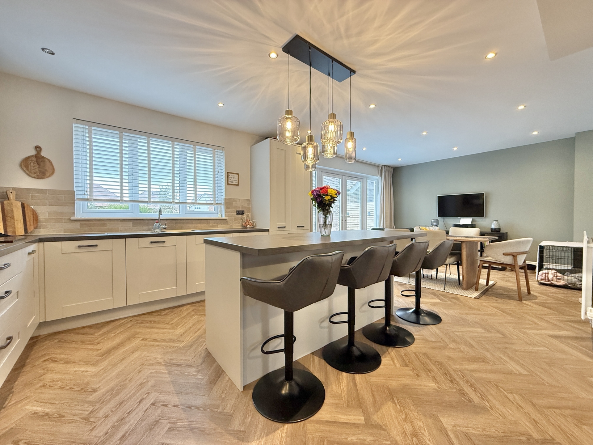 KITCHEN/DINING/LIVING ROOM: 7.7m x 3.8m (25'3" x 12'6"), Base cupboards and drawers with worktop over, sink and drainer, built in oven with separte hob with hood over, wall mounted cupboards, built in fridge and freezer, built in dishwasher, island with storage under, radiator, double glazed window to the rear, double glazed doors to the rear, doorway to utility.