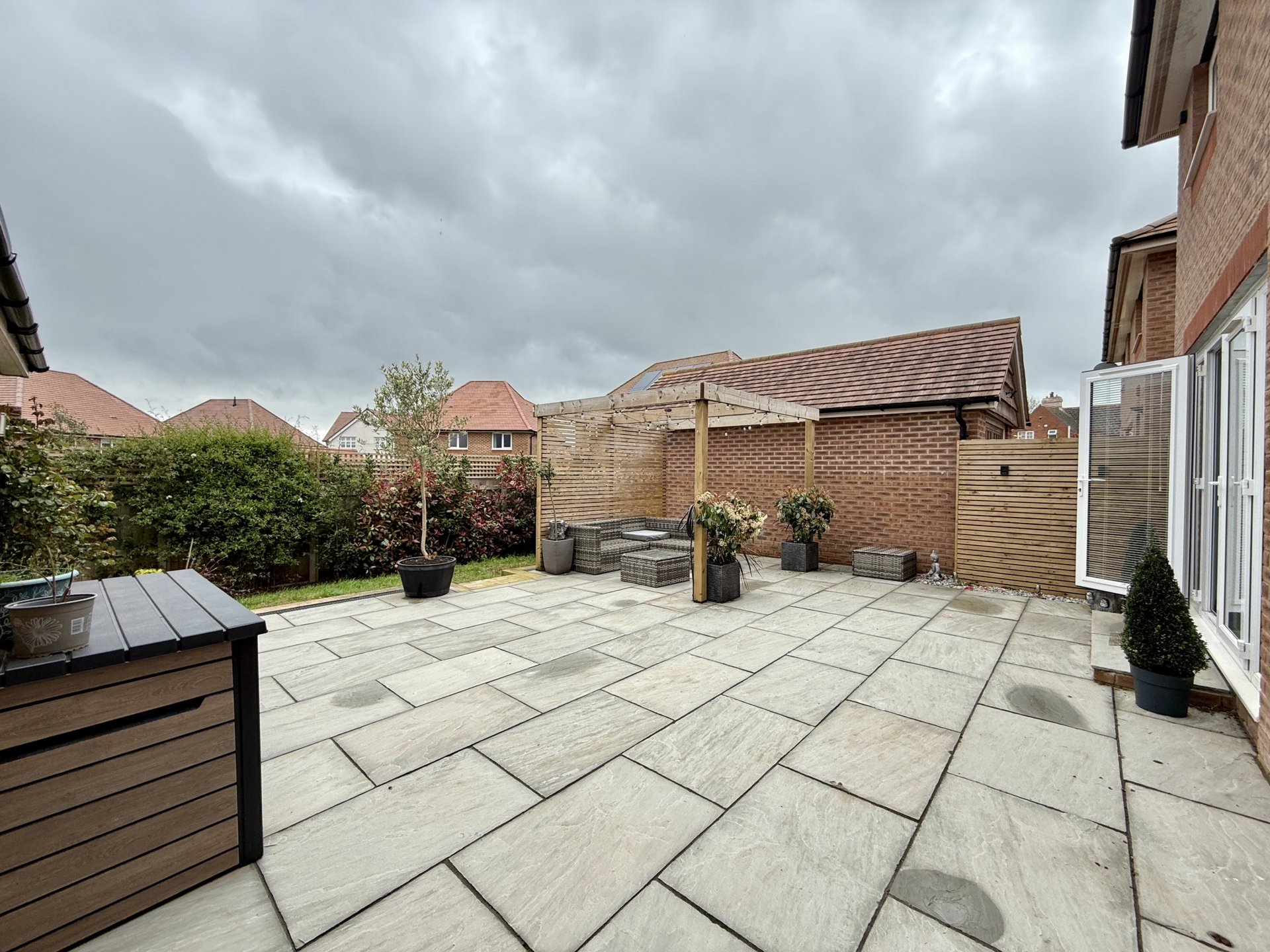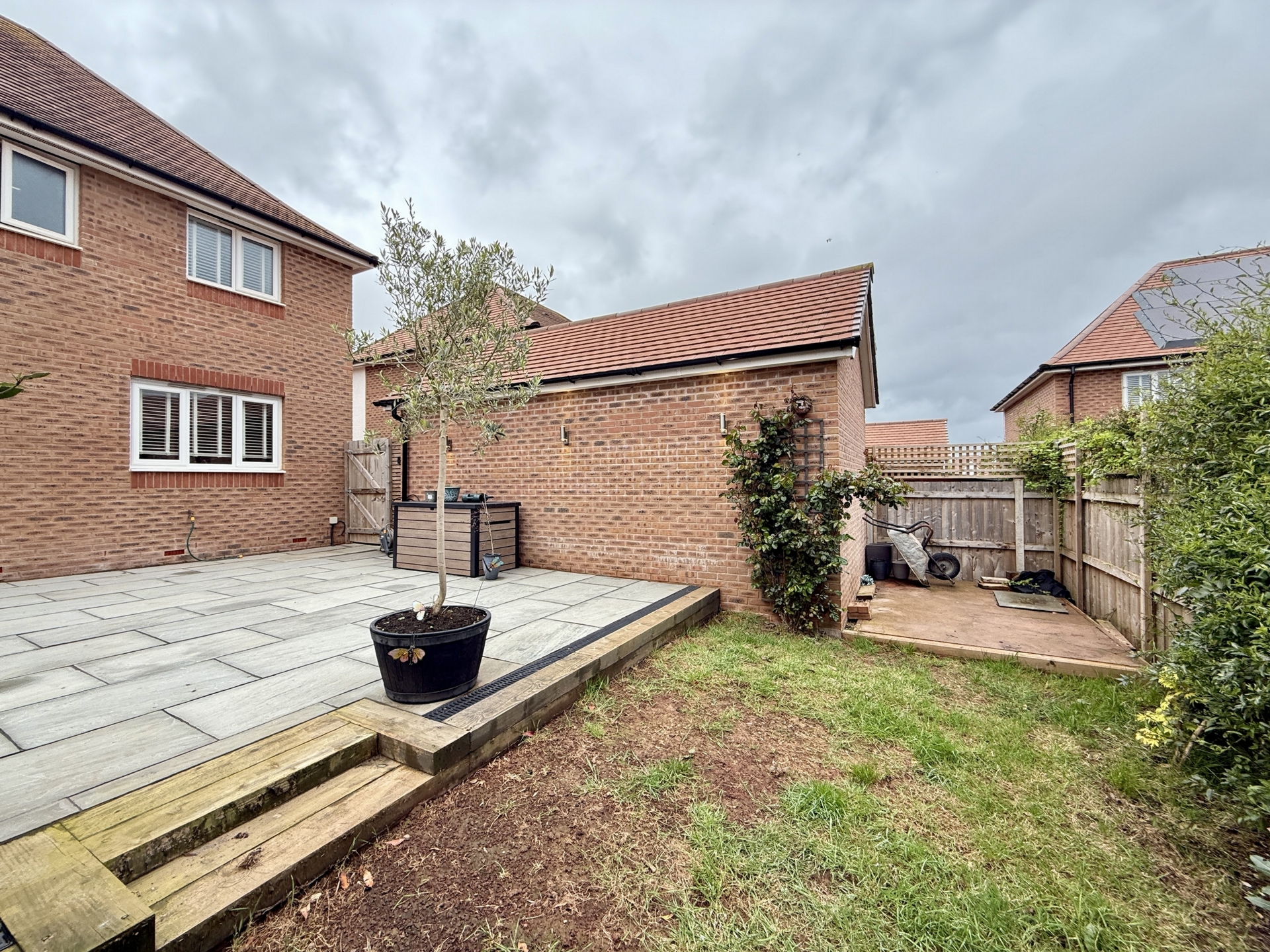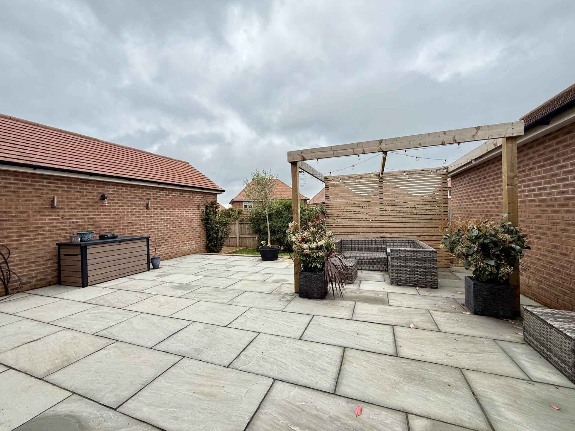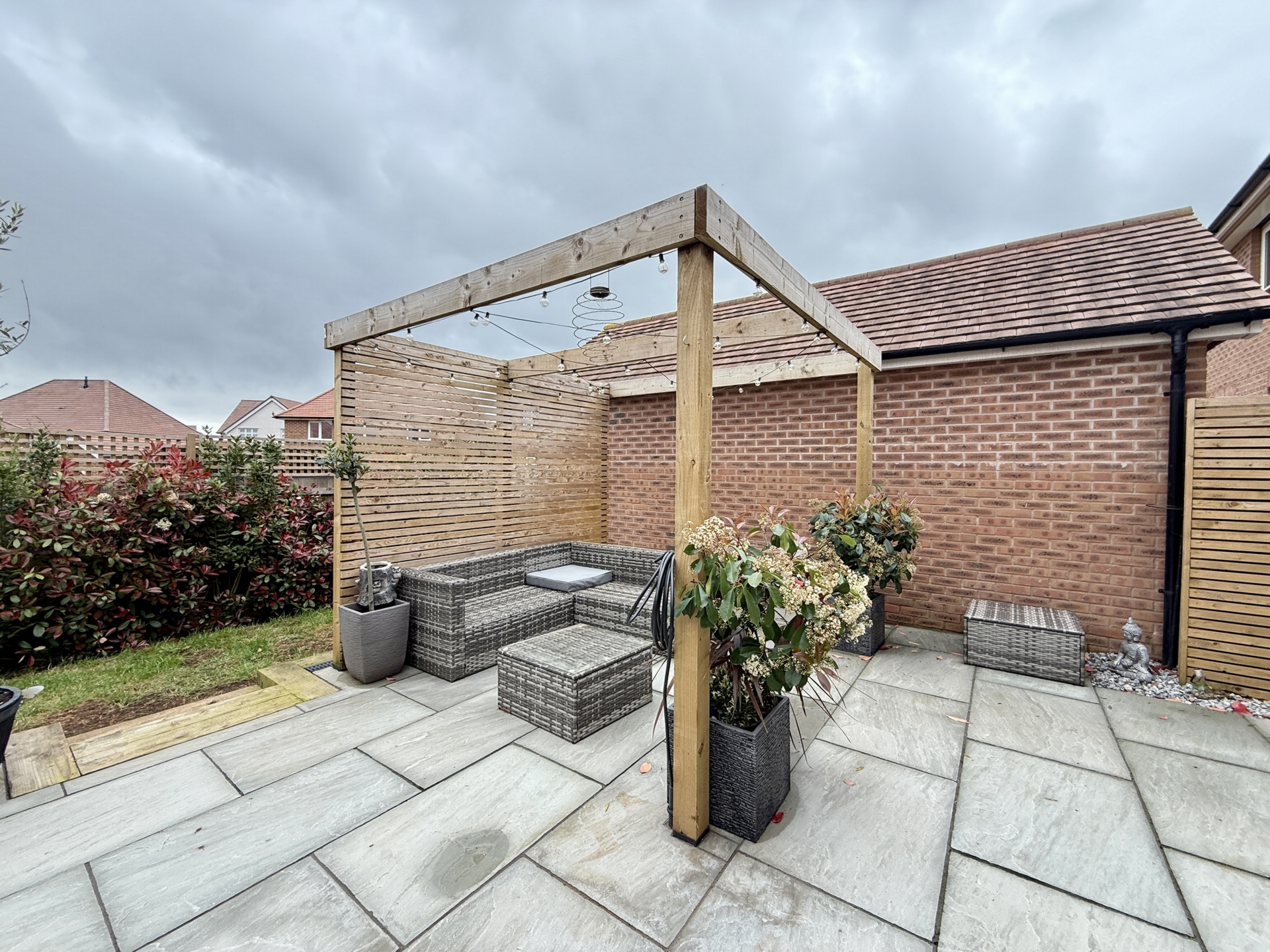OUTSIDE: To the front of the property is an area designed for off road parking which leads to the garage and front door with section of bark chippings and shrubs. To the rear is an enclosed garden with a feature paved are and lovely wooden pergola. Steps lead down to a section a grass and useful area behind the garage.