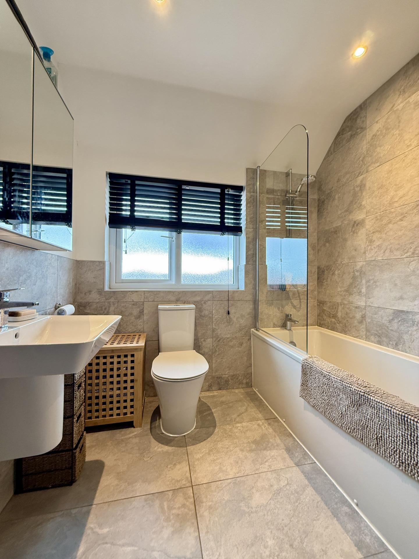 BATHROOM: Close coupled WC, wash hand basin, panelled bath with shower over, radiator, double glazed window to the rear.